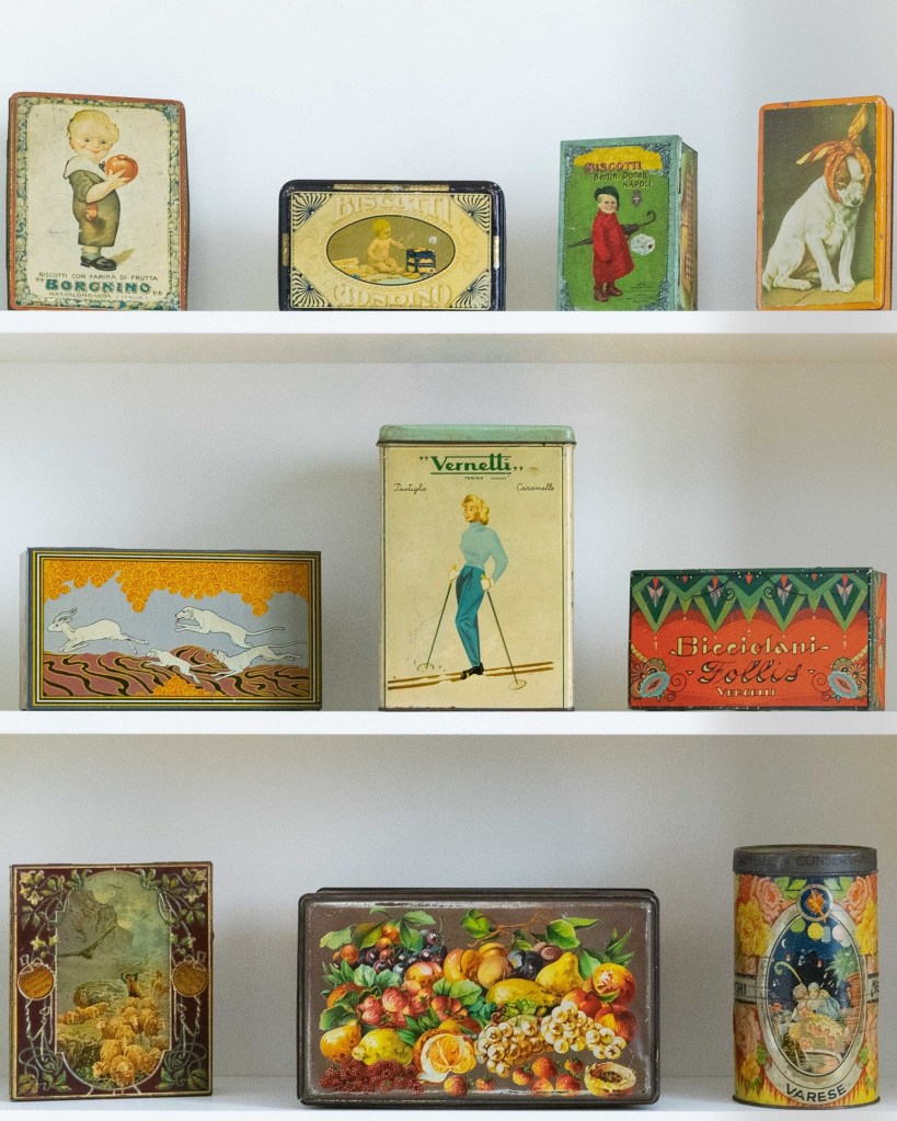 Tra le scatole si potranno ammirare: i ricercatissimi bidoni Saiwa insieme ad una versione della scatola Saiwa con dedica di Gabriele D’Annunzio, alcune fra le prime scatole Delser risalenti al 1905, le magnifiche litografie della Lazzaroni amaretti di Saronno, Caffè Frank con Estratto Olandese Elefante, i cilindri Venchi, Mera&Longhi e molti altri. Tra i grandi produttori di giocattoli: Günthermann, Lehmann, Gama, Kohler, INGAP e Bell, con i famosi Also, Zulu, Tap Tap e Na-Nu firmati Lehmann, le splendide farfalle, insieme ai prestigiosi Charlot e una sezione di cannoni da guerra.