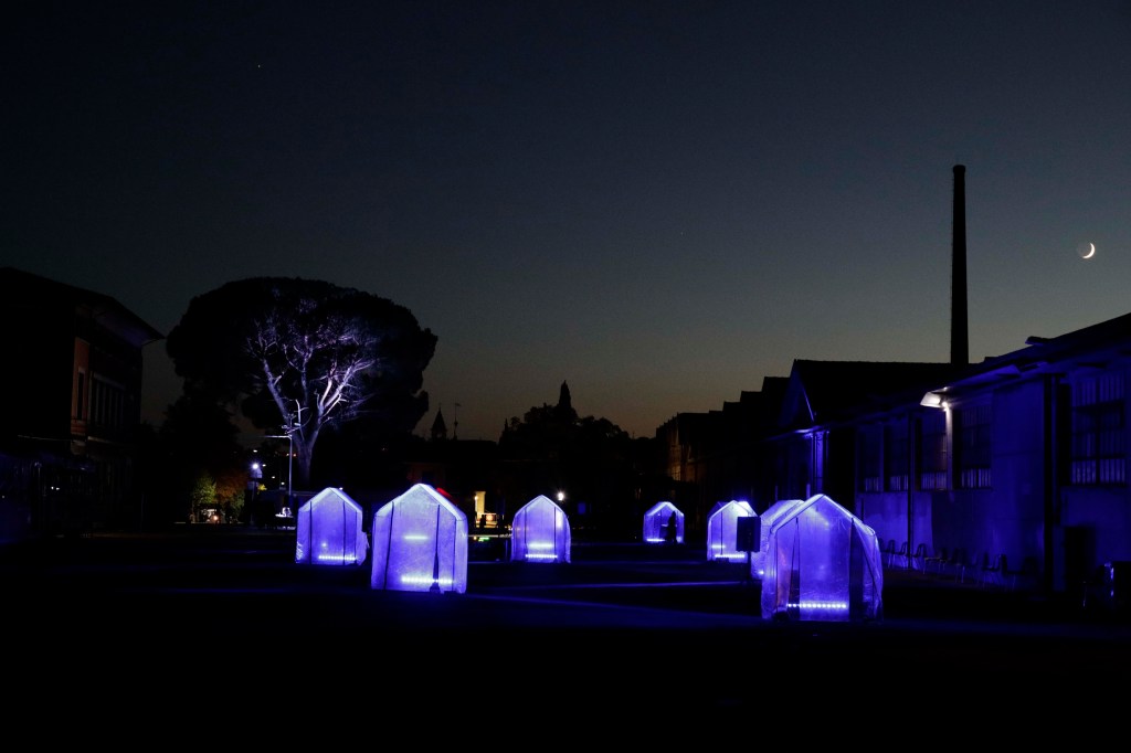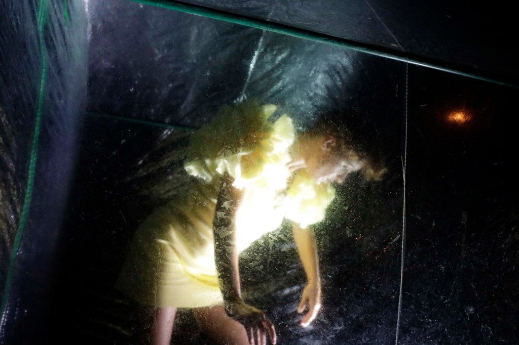 Ogni capitolo offre una detonazione. Ogni capitolo è un tentativo d’ esposizione, un pezzo unico. Ogni performer è isolato nel proprio micromondo, con un velo plastico che fa da diaframma, protezione e lente d’ingrandimento del proprio immaginario esploso. Li accomuna un disegno sonoro che come una preghiera laica fa da sottofondo, creando una partitura orchestrale da cui emergono le parole, i canti e i suoni di ogni teca.