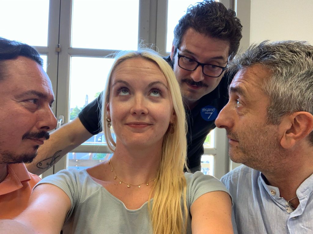 “Arriviamo da un lungo periodo di chiusura: non potevamo che tornare subito sul palco. Per offrire una risposta al bisogno del pubblico, per far sentire la nostra presenza. Abbiamo deciso di buttarci a capofitto nel nostro mestiere, finalmente, portando in scena una commedia leggera. Ci siamo orientati sul testo più conosciuto di Luigi Lunari, Tre sull’altalena, che abbiamo adottato in maniera pressoché integrale con l’eccezione di alcuni tagli interni”, spiegano i quattro riuniti in questi giorni a teatro per le prove.