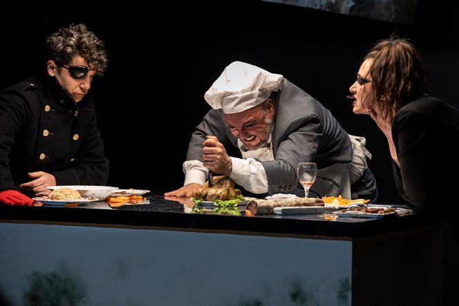 In questa messa in scena, con solo tre attori a rappresentare tutti i personaggi