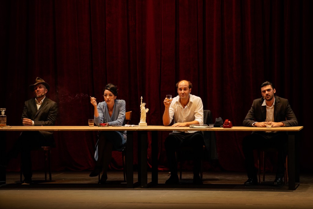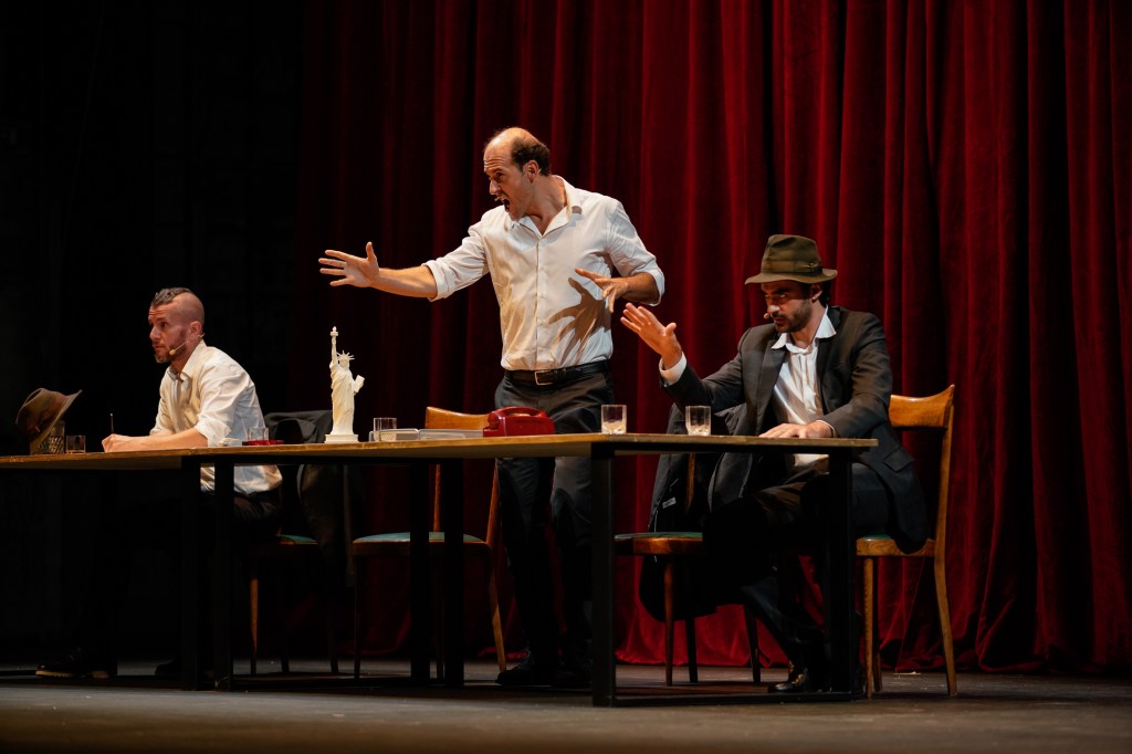 Al centro del palco un enorme tavolo che si trasforma di scena in scena: è una sala da pranzo a New York, è l’ufficio di un produttore a Los Angeles, è il banco a cui sono chiamati i sospetti comunisti a Washington. Qui, su questo tavolo, sotto gli occhi di un’immobile piccola Statua della Libertà, si gioca la Storia di un paese e delle sue contraddizioni, politiche e sociali, che riverberano sulla storia personale di un uomo.