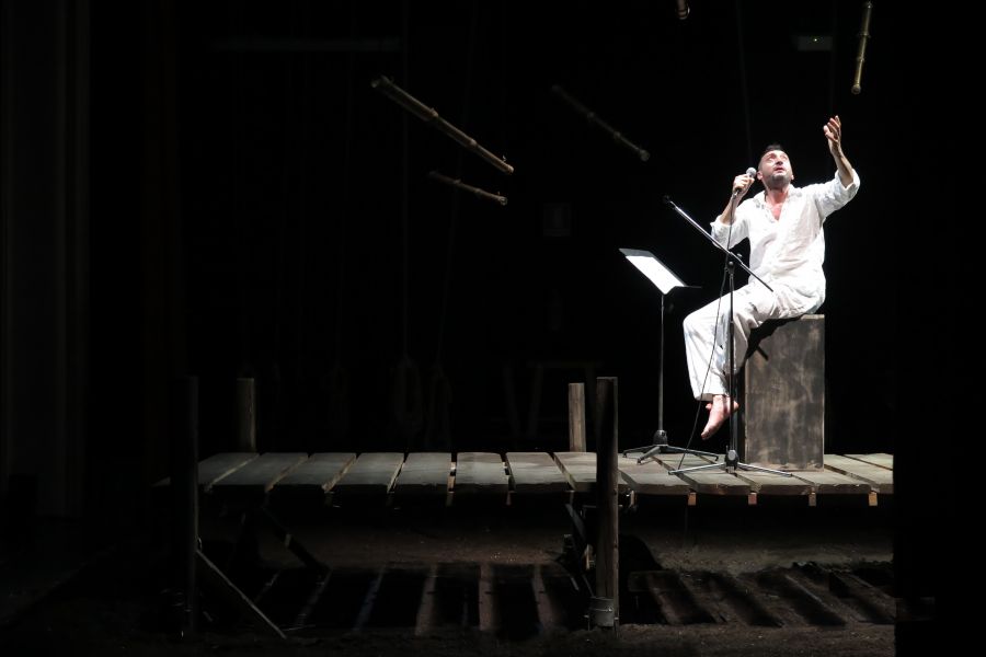 Uno spettacolo catartico, di grande intensità emotiva. Corrado d’Elia, nei panni di un moderno aedo, incanta il pubblico immerso in una scena di grande effetto. La storia la conosciamo: il Capitano Achab, al comando della baleniera Pequod è alla ricerca di Moby Dick, la terribile, mostruosa balena bianca che anni prima, durante una battuta di caccia, gli ha amputato una gamba, distrutto una nave, mandato a picco il carico e ucciso molti uomini. Achab, accecato dalla sete di vendetta e contro ogni ragione, conduce la nave per mari pericolosi, alla ricerca ossessiva della balena, la quale, nonostante venga più volte ramponata, riesce sempre misteriosamente, quasi diabolicamente, a salvarsi.