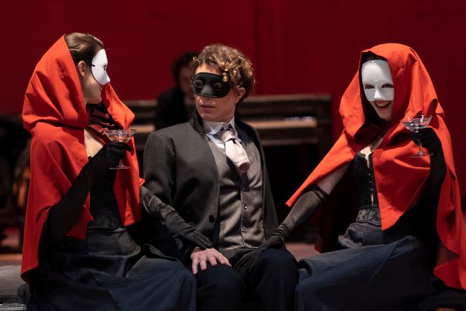 Su una scena disegnata da arredi che il regista ha voluto anneriti da un fuoco che simbolicamente distrugge le strutture tradizionali, imponendo loro un ormai inevitabile rinnovamento, si muovono diversi Fridolin e diverse Albertine: il tema del doppio ‘esplode’ in un gioco di riflessi che riverberano all’infinito voci e sguardi.