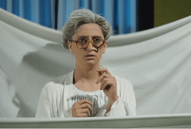 Avvolta in una lunga veste bianca è lasciata alle cura di Martino che lei all’inizio rifiuta, specialmente durante il momento della vestizione perché non comprende del perché, lei donna, debba essere vestita da un uomo, ma poi comincia ad abituarsi alla sua presenza, anche se continua a mostrarsi assente e si abbandona a un discorso tutto suo rivolto a persone assenti. Martino, che ha preso confidenza con la presenza della donna, inizia a sua volta a parlare con la donna, raccontando la propria attrazione per la collega Jessica. Quello che sembra un dialogo diventa un raccontare se stessi a persone altre.