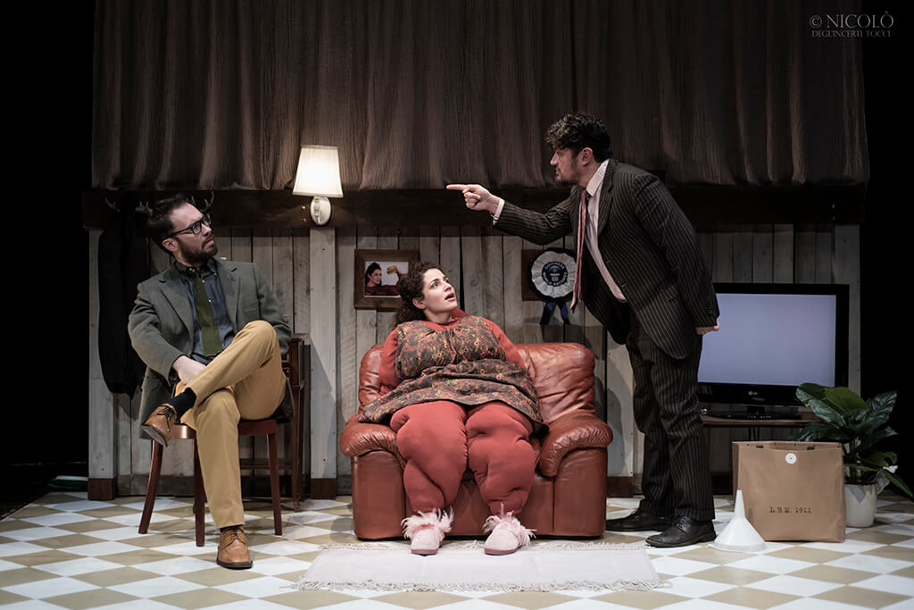 Una grossa crepa minaccia la sicurezza della casa in cui vivono i protagonisti di questa storia, ma solo uno di loro sembra preoccuparsene: è l’Uomo del piano di sotto che da mesi tenta di convincere la coppia di vicini a intraprendere i lavori di ristrutturazione. Il problema è che la crepa si trova proprio sotto il divano della Donna più grassa del mondo che pesa quattrocentosessanta chili e non può muoversi. L’unica possibilità per poter intraprendere i lavori sarebbe che il Marito la convincesse a dimagrire, ma la felicità che le procura il cibo è troppo grande perché la donna possa rinunciarvi. In un’epoca in cui sembra che la nostra società abbia raggiunto il suo massimo grado di benessere, questa commedia, attraverso una cifra grottesca e paradossale, induce a riflettere sulla capacità dell’uomo di immaginare un modo alternativo per raggiungere la felicità che non lo condanni all’autodistruzione.
