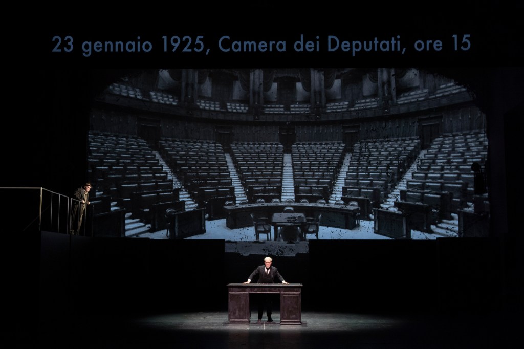 Adattamento in trentuno quadri del romanzo storico di Antonio Scurati “M”, lo spettacolo firmato da Massimo Popolizio ha una struttura circolare, che si apre con l’ultima battuta del libro per poi tornare a quella stessa fatidica frase pronunciata in Parlamento da Mussolini al momento di “addossarsi la croce del potere”: Se il fascismo è stato un’associazione a delinquere, io sono il capo di questa associazione a delinquere.