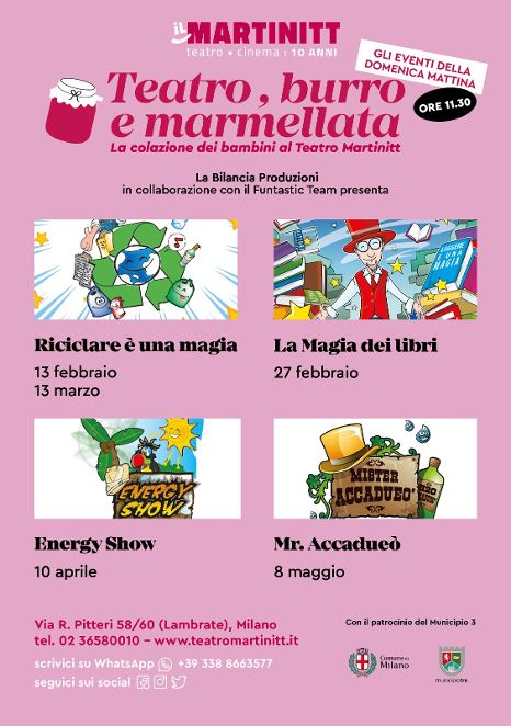 Dopo il successo dell’esperimento di inizio anno, in occasione della Befana (e non solo), il Martinitt ha programmato uno speciale contenitore family che, con 5 appuntamenti la domenica mattina tra febbraio e maggio, invita i piccoli e i loro genitori a fare colazione con… TEATRO, BURRO E MARMELLATA.