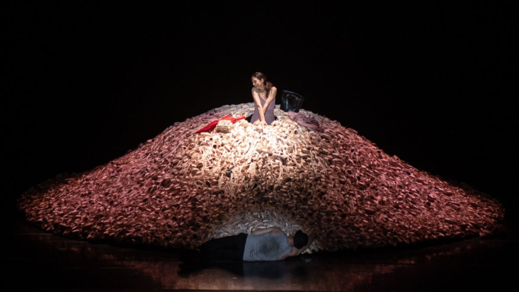 Con L’Heure Exquise, basato su Oh, les beaux jours (Giorni felici), uno dei momenti più alti del teatro di Samuel Beckett, Alessandra Ferri celebra i quarant’anni di carriera interpretando Winnie – la ballerina “âgée” immaginata nel 1998 da Maurice Béjart – che, nella sua malinconica solitudine, vive nei gioiosi ricordi di giorni felici. Willy, impersonato da Thomas Whitehead, è un ex-partner di Lei, sommersa qui non dalla famosa collina di sabbia, bensì da una montagna di vecchie scarpette da punta. È un altro personaggio femminile per Alessandra Ferri, dopo Virginia Woolf, Eleonora Duse e Léa di Chéri, tutte donne eccezionali che appartengono a questo capitolo della sua vita. Scrive Béjart: «Tutti i grandi musicisti hanno fatto delle “variazioni” su un tema di un altro grande… Io mi sono permesso di lavorare su una pièce tra le più importanti del ventunesimo secolo. In verità non si tratta di un adattamento danzato, ma di un lavoro di composizione fedele allo spirito dell’autore e tuttavia nel contesto di una creatività puramente astratta e coreografica. La musica è un montaggio su temi di Webern, in primo luogo, ma anche di Mahler e Mozart. I pochi testi sono le parole pronunciate da una ballerina nel momento della danza o del riposo. Infine, il Silenzio: l’elemento principe di questa liturgia».