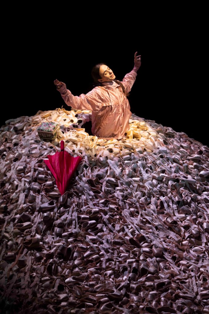 Ogni tanto la donna si avvicina alla struttura dalla quale era uscita e prende in mano una borsetta che contiene vari oggetti, tra cui una pistola: in Beckett l’arma è stata requisita da Minnie perché Willie non la usasse contro se stesso. Sempre riferito alla commedia di Beckett è l’ombrello rosso che Willie porge a Minnie che lo userà durante i movimenti di danza. Su quell’armonia, quella ritrovata felicità si chiude il sipario, che si riapre dopo qualche minuto perché, sulle note di “L’heure exquise qui nous grise” da “La vedova allegra di Lehar”, c’è un’appendice dove appare Minnie sepolta fino al collo dal cumulo di scarpette da ballo mentre recita un passo della commedia in cui lei è protagonista. Ancora una volta il masso di scarpette si schiuderà e Minnie ne uscirà. Indossa una lunga tunica trasparente e così vestita inizierà a ballare con Willie un veloce tip-tap sulle note di “Tea For Two”. Ma i giorni felici fatti di ricordi ritrovati saranno destinati a finire…