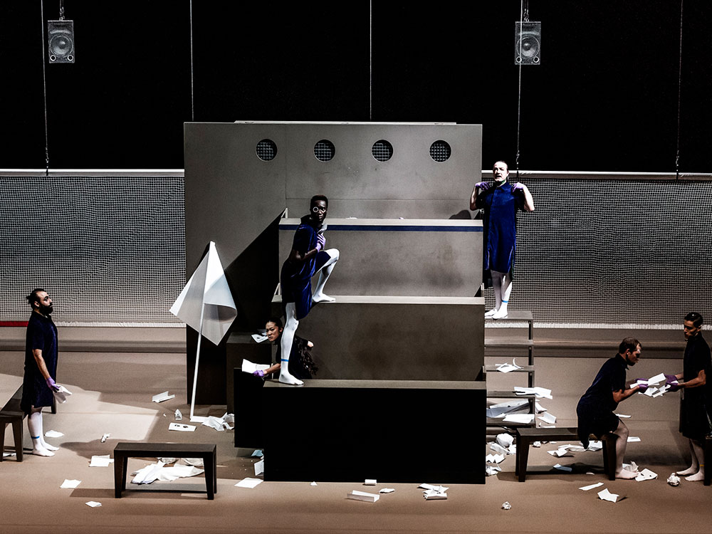 Parla del male quest’opera della brava coreografa capoverdiana: il male che è, come dice il sottotitolo, un’ubriacatura divina quasi che da esso non ci si possa sottrarre e affronta il tema nelle sue varie manifestazioni. Nove artisti in scena che interpretano uno spettacolo di danza e di teatro dove le parole sono onomatopeiche, oppure sono assenti e sono sostituite da gestualità. Quando si entra nella sala del teatro è possibile intravvedere gli interpreti seminascosti sul fondale da un pannello trasparente mentre giocano una partita di palla a volo. nel centro del palcoscenico una tribuna a tre piani dove si svolgerà gran parte delle azioni. A luci spente in sala, entra in scena uno degli interpreti che, imbracciando un kalashnikov, fa cenno ai personaggi che giocavano di portarsi dalla sua parte e li fa camminare lungo tutto il palcoscenico, per far loro iniziare l’azione Erano forse suoi prigionieri? Costoro camminano lentamente in uno stato catatonico. All’inizio il tutto si svolge in silenzio, poi una musica altissima fatta di soli strumenti a percussione invade lo spazio, l’uomo che imbracciava il kalashnikov non sembra dare più ordini e, da aguzzino qual era, ora fa parte anch’egli dei prigionieri. Tutti e nove i personaggi, in varie fasi, cominceranno a disporsi sulla tribuna e mimeranno diversi stati d’animo di sofferenza e, più raramente, di contentezza. Maneggeranno fogli di carta bianchi, ne faranno piccole costruzioni che poi distruggeranno, buttandoli sul pavimento. La musica che viene diffusa sarà da stimolo per farli agire nei modi più svariati. La loro disposizione sulla tribuna fa pensare che essi potrebbero essere dei giudici oppure una giuria o anche, considerati i vari lamenti o certe espressioni addolorate sui loro volti, delle vittime del male che si manifesta in varie forme. Quando cercano di comunicare qualcosa la loro voce è afona oppure incomprensibile, quando vogliono esprimere il proprio stato d’animo del momento lo fanno mimetizzandone la tipologia con l’espressione del volto che è ora dolorosa, ora allegra. Il tutto sa di grottesco. Le mani indossano guanti viola a significare che essi non vogliono sporcarsi con le carte che devono esaminare. E quelle stesse carte vengono lette sommariamente, oppure utilizzate altrimenti: accartocciate e buttate via, ingoiate, o per detergersi dopo le funzioni corporali. Al termine delle tante azioni che i personaggi compiranno sulla scena, verranno riaccompagnati dietro il pannello trasparente del fondale dall’uomo che all’inizio imbracciava il kalashnikov e che ora, invece, regge l’asta di una bandiera bianca. E si spengono le luci.