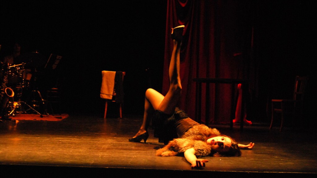 A metà tra teatro e cabaret musicale, Bar Blues narra la storia di un’eroina del quotidiano postbellico milanese, di una donna che vive alla continua ricerca dell’amore. In una profonda immedesimazione con l’attrice Rita Hayworth, il personaggio – malgrado i dolori, malgrado le lagrime – attraversa la vita ballando, cantando e seducendo. La voce e il corpo di Federica Bognetti e il sax di Emiliano Vernizzi raccontano le vicende di un personaggio dal passato pieno di delusioni, amori perduti, inganni. Sullo sfondo delle sfavillanti atmosfere del varietà di un tempo, la protagonista ripercorre con ironia ricordi dolorosi, incontri con uomini che vanno e vengono, voglie d’amore mai del tutto appagate. Al centro la sua storia d’amore con Gino, uomo furbo e seducente che approfitta della donna per uscire dal carcere e pagarsi i debiti. Bar Blues è uno spettacolo in cui le canzoni di Luciano Virgili, Dino Rulli,Tommaso de Filippis, Jeanne Moreau, Dominique Duhamel, Allan Roberts e Mark Gordon si fondono con una fisicità disperata e con le parole potenti del grande maestro Testori.