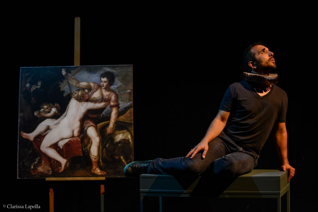 Il tema amoroso è, dunque, centrale e Giuva (unico attore in scena), nei panni di un docente, attraversa il racconto del mito e l’analisi della composizione lirica shakespeariana: partendo dalle dinamiche relazionali tra i due protagonisti – Venere, dea dell’amore e della bellezza, e Adone, giovane uomo vittima delle ossessioni amorose di lei – l’attore ragiona con ironia sulle due figure archetipiche per poi scivolare nel racconto di una storia d’amore, altrettanto incompiuta, tra due giovani dello stesso sesso. Le cornici dei versi di Shakespeare si fondono al testo originale per raccontare un’esperienza privata che diviene universale biografico, attraverso il quale riflettere sulle difficoltà dell’esperienza amorosa, sulla questione identitaria e sull’articolata relazione tra amore/desiderio/forma/natura. Uno spettacolo che parla soprattutto a giovani e adolescenti, alle prese con la scoperta del corpo e del desiderio.