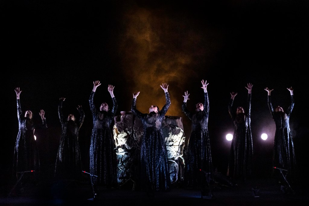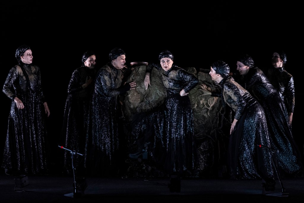 La magistrale rappresentazione creata da Serena Sinigaglia si distingue per la curatissima messa a punto di ogni dettaglio. In primis, la scelta di chiamare sette attrici bravissime provenienti da diverse esperienze teatrali, con le quali lei aveva già lavorato in passato, e che, secondo una sua dichiarazione, ha voluto che fornissero una recitazione corale che non mettesse una in primo piano piuttosto che un’altra, eliminando così ogni forma di protagonismo. Esse, oltre a sostenere tutte e sette la funzione del coro, hanno brillato singolarmente nei seguenti ruoli: Francesca Ciocchetti (Adrasto), Matilde Facheris (Messaggero e bambino), Maria Pilar Perez Aspa (Ifi), Arianna Scommegna (Teseo), Giorgia Senesi (Atra e Atena), Sandra Zoccolan (Evadne) e Debora Zuin (Ambasciatore, nel testo di Euripide è chiamato Araldo). Assegnare loro anche i ruoli dei personaggi maschili non è stata una scelta di mero effetto teatrale ma sostanziale per mettere in evidenza che le vere protagoniste dell’opera sono le donne, che se da una parte risultano vittime, allora come ora, dell’imperante potere maschile, dall’altra sono quelle che si distinguono per il coraggio e la determinazione nell’affrontare le situazioni più drammatiche. Il loro coro è l’affermazione della femminilità che proprio nel dolore, e a causa di questo, diventa tetragona. Dal punto di vista formale dell’ambientazione la scenografa Maria Spazzi ha creato un paesaggio buio non collocabile in un luogo né in un tempo precisi, e sinonimo di sito di sofferenza. Così come sono sofferti i volti delle donne dagli occhi vistati di copioso kajal e indossanti i bellissimi costumi di Katarina Vukcevic dal nero intenso che cambiano di intensità grazie al sapiente apporto delle luci di Alessandro Verazzi. Luci che costituiscono ulteriore elemento di spicco nell’illuminazione cromatica tendente al blu nelle varie fasi dell’opera per mutare in un giallo oro al momento della comparsa di Atena sul masso che in quel momento simboleggerà un altare. Le musiche, di grande effetto quando si fanno martellanti grazie all’uso dei soli tamburi in alcuni dei passaggi più drammatici dell’azione, diventano foriere di pathos nei canti del coro, curati da Francesca Della Monica, e fanno da chiusura a uno spettacolo di enorme spessore qualitativo che si è guadagnato applausi calorosi da parte di un pubblico entusiasta. Repliche fino al giorno 19 febbraio.