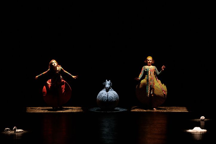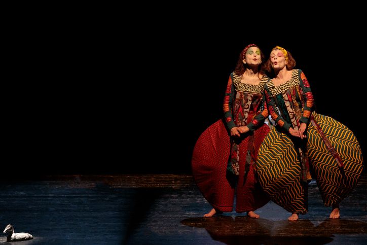 In scena un intreccio di narrazione e partitura fisica, le attrici indossano costumi scenografici decorati e la partitura originale di suoni e musica mescola passato e presente. Al centro il lavoro dell’attore creativo con il suo corpo e la sua voce.