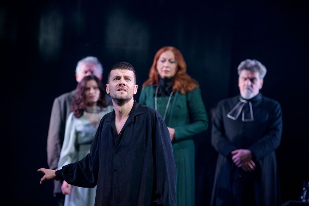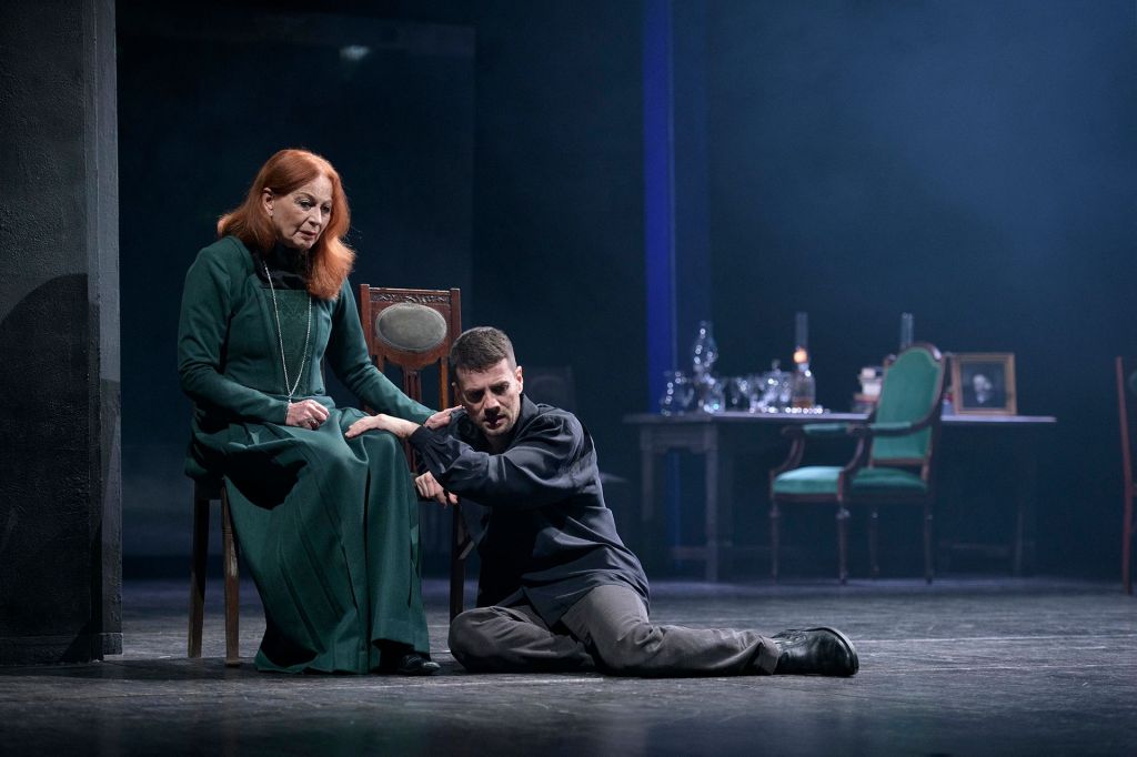 “Spettri” appartiene al periodo del cosiddetto teatro borghese che Ibsen scrisse in lingua danese durante la sua permanenza a Roma, nel 1881. Fu rappresentato per la prima volta a Chicago l’anno successivo in lingua originale e solo nel 1883 andò in scena in Norvegia, peraltro non accolto favorevolmente a causa della scabrosità del tema. La vicenda è nota: è ambientata in una campagna norvegese dove vive la vedova del Capitano Alving, Helene, che si sta adoperando per gli ultimi preparativi necessari all’inaugurazione di un asilo realizzato grazie al lascito del marito. Gli altri personaggi sono il pastore Manders, collaboratore dell’iniziativa, il figlio di Helena, Oswald, appena arrivato da Parigi dove ha trascorso due anni di studio, il falegname Engstrand e sua figlia Regine che vive in casa Alving. La versione in italiano e l’adattamento di Fausto Paravidino, pur mantenendosi fedele al testo originale ed eliminando solo poche battute non indispensabili all’azione, assembla i tre atti originali in uno unico di circa un’ora e trenta, reso possibile anche grazie al fatto che la lunghezza del dramma voluto dall’autore non fosse particolarmente cospicua. Questo ha dato la possibilità al regista di rendere più fluide le azioni che si susseguono e che costituiscono l’ossatura del dramma, dove tutto inizia in sordina, all’apparenza senza alcun momento particolare e degno di nota, ma che poi si sviluppa in un crescendo fino ad arrivare alla drammatica e sconvolgente rivelazione finale. Gli spettri del titolo sono quelli sepolti nella mente di Helene e che periodicamente la vengono a visitare e a condurla all’angoscia, sono anche quelli del figlio Oswald, che rivive con dolore il suo vissuto per la l’assenza affettiva della figura paterna. Ma sono pure i fantasmi del passato che si aggirano, invisibili e silenti, ma non per questo meno presenti nella casa, a tratti avvolta da un fumo a simulare nebbia, e che è ben rappresentata da una scenografia dai toni scuri con un arredamento essenziale e un luminoso lampadario sospeso in alto che rimanda a un tempo che non c’è più, il tutto realizzato con accuratezza da Adomas Jacovskis. La vicenda si concentra maggiormente sul rapporto tra Helene e Oswald, dove la donna cerca di donare al figlio, finalmente tornato a casa dopo l’assenza di due anni, un focolare che gli dia il senso della famiglia, mentre questi si mostra recalcitrante, in quanto, per lui, dopo l’esperienza vissuta a Parigi, la famiglia non deve essere costituita necessariamente da persone consanguinee. Ma c’è altro a dargli il maggior tormento ed è quello che rivelerà alla fine.