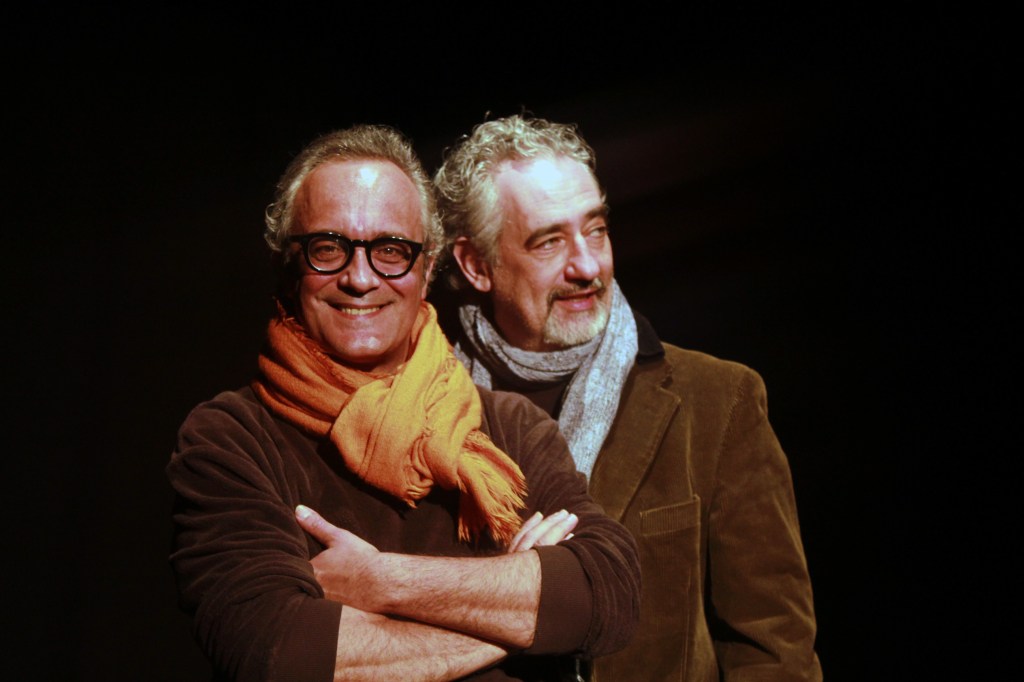 Uno spettacolo costruito con un linguaggio spezzato, volutamente non descrittivo e non retorico. L’artista che vive e crea nella carne e nella passione sa che nulla è semplice e che l’altro esiste. La storia di due fratelli che è la metafora del doppio, di due opposti che si attraggono, di due opinioni divergenti, destra e sinistra del nostro cervello, di una duplicità alla ricerca dell’unità. La ricerca ultima dell’armonia dei contrari. Dialoghi asciutti, monologhi feroci, parole che svelano i nostri mostri interiori, il bisogno di affermarsi, la paura del fallimento, il desiderio di emergere, frasi rubate alla vita divenute parole di polvere e nebbia nel cuore. Uno spettacolo sul tempo che abbiamo vissuto e non sempre compreso. Pezzi sparsi di cose non dette, fotografie che fanno piangere, somme di esperienze che sono la somma di sogni e di orrori. E poi i ricordi che cullano, le promesse di un futuro da cambiare. In mezzo l’amore, le prime scoperte, i piccoli brividi, i giochi d’infanzia, i salti nel vuoto nel mondo adulto, la presa di coscienza dei nostri limiti e la voglia di superarli. Il successo professionale e il suo retrogusto amaro. Tutto questo attraverso la storia di due fratelli che, camminando su due binari paralleli, non si incontreranno mai, se non al punto d’arrivo, laggiù in fondo, al tramonto, dove dovranno imparare a perdonarsi o a schiantarsi. I due fratelli hanno il dovere di invocare la sincerità, anche quella più oscura, perché la menzogna separa gli uomini non meno dell’avidità.