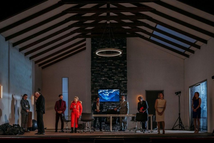 La rappresentazione è ambientata nei nostri giorni, presumibilmente in uno chalet di montagna (vengono menzionate le piste da sci) e si svolge su due livelli separati da un telo trasparente, che viene di volta in volta calato dall’alto, divide le azioni che accadono nella parte principale del palcoscenico e i diversi “a parte” del protagonista sul proscenio e funge anche da schermo che proietta immagini di primi piani ripresi in contemporanea. Nei dialoghi si compiono riprese televisive, si parla di pacchetti azionari in luogo di ricompense, di selfie, di smartphone, di auto e moto, di fake-news per diffondere calunnie in un linguaggio che è quello di oggi. Siamo nel pieno della società dell’immagine dove quello che conta non è l’essere ma l’apparire e Riccardo, con il suo fisico sgraziato, deve faticare più degli altri a farsi benvolere: nasconde la perfidia sotto la ruffianeria, sa essere mellifluo, accondiscendente, fa della sua falsità una virtù tanto da compiacersene. In questo modo ottiene anche l’inottenibile quando rende succube Anna, la vedova del Principe di Galles che lui aveva fatto uccidere, e riesce a sposarla. Usa le persone per raggiungere i suoi scopi e, una volta ottenutili, si sbarazza di loro facendoli sopprimere e i loro cadaveri, chiusi in sacchetti neri, si accumulano pian piano in un angolo del pavimento. Eppure il suo essere spregevole secondo la morale corrente attira quasi una forma di simpatia nel pubblico quando egli vi si rivolge confidenzialmente nel palesare le sue trame per conquistare il potere e rivela i suoi disegni omicidi: è la forza della manipolazione posseduta dai dittatori presenti nella nostra società. E così mentre nella prima parte sono appena accennati i riferimenti ai momenti che sta attraversando la scena geopolitica internazionale di questi anni, nella seconda, quando Riccardo ha raggiunto il potere e sente la necessità di alleati, vengono nominate apertamente città quali Mosca, Teheran, Pechino. In questo il dramma assume due diversi aspetti: nella prima parte viene quasi trasgredito nella sua essenza tanto che lo stesso Pierobon ha dichiarato in un’intervista che “c’è l’intrigo e un tono quasi da grottesco vaudeville” e solo “nella seconda prevale l’incubo e lo stravolgimento delle cose, ritorna la tragedia”. Il finale, avvenuta l’uccisione di Riccardo, induce a una triste considerazione quando Elisabetta, recita il monologo che nel testo originale è affidato a Richmond, qui reso più drammatico, e che ha per oggetto la situazione internazionale dell’epoca attuale.