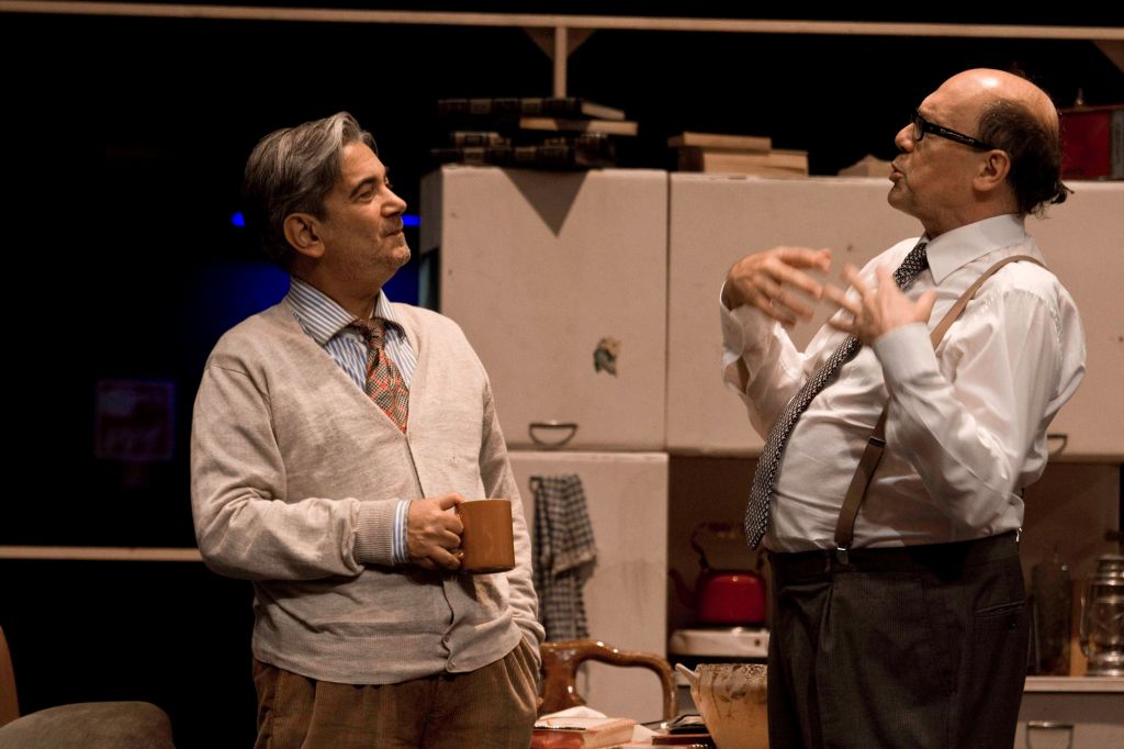Il vizio dell’arte è quello che affligge gli artisti e, come tutti i vizi, è inestirpabile, bisogna assecondarlo continuamente altrimenti si trasforma in ossessione. Ne sono vittime il poeta Audin e il compositore Britten. I due sono amici, ed ex amanti in tempi lontani, non si frequentavano da molti anni e ora si incontrano nel 1972 in un modesto appartamento che l’Università di Oxford ha messo a disposizione del poeta. È questo l’argomento della commedia “Il ritorno di Calibano” che una compagnia di attori sta provando in un teatro londinese. Audin e Britten sono interpretati, rispettivamente, da Fritz e da Henry. Il primo ha una tendenza a dimenticare le battute mentre il secondo, che appare più sicuro di sé, è costretto anche a recitare nel ruolo di Boyle, il cameriere di Audin, perché l’attore che ne dovrebbe sostenere la parte è impegnato altrove per una matinée. Accanto a loro cerca di emergere, con la sua mania di protagonismo, Donald che impersona Hunphrey Carpenter, il biografo delle vite dei due artisti e Tim, l’attor giovane che è Stuart un marchettaro venuto a farsi fare una fellatio da Audin. Presente anche il pignolo autore della commedia che non accetta le modifiche al testo apportate dal regista che è assente ed è sostituito dalla direttrice di scena Kay la quale cerca con pazienza di coordinare il tutto. Il palcoscenico è occupato da due poltrone con un piccolo tavolo da salotto e da libri e oggetti vari disposti confusamente. Nel fondo i mobili di un tinello. L’incontro tra i due protagonisti è immaginato nel 1972 nell’appartamento di Audin sessantacinquenne, descritto come un uomo che nasconde la propria depressione in atteggiamenti provocatori, è incurante della cura della sua persona, indossa pantaloni maleodoranti perché sporchi di urina ed è solito pisciare nel lavandino. Soffre del fatto di non ricevere più proposte di scrittura e vede, quindi, nella visita di Britten, l’occasione propizia per soddisfare le sue necessità artistiche. Il compositore va a trovarlo per chiedergli consigli in merito a una nuova opera della quale sta ultimando la scrittura, “Morte a Venezia”, tratta dall’omonimo racconto di Thomas Mann, ed è timoroso perché l’argomento trattato possa ricevere accuse di pedofilia. Tra alti e bassi, scene in cui agli attori viene anche chiesto di interpretare le parti di oggetti (letto, porta, orologio, specchio…) perché “Siamo di fronte a un poeta. Parla il mondo e tutto quello che contiene”, dirà l’autore, e con intermezzi non previsti, le prove della commedia si concludono con il calare della sera. Gli attori escono, si attardano sul palcoscenico rimasto vuoto, l’autore e Kay che farà le sue considerazioni sul teatro e sulla psicologia degli attori che “sono come i soldati. I soldati temono il nemico; gli attori temono il pubblico. Paura dell’insuccesso. Paura di dimenticare, paura dell’arte”. E il tema principale della pièce è rappresentato proprio dalle peculiarità del teatro dove oltre la rappresentazione, oltre quello che appare al pubblico ossequiante ci sono persone votate all’arte della recitazione con le loro debolezze, idiosincrasie, gelosie e paure. E comunque con la loro passione. Lo è l’attore Fritz che ha paura di perdere la battuta ma rimane infastidito quando l’assistente gliela suggerisce, lo è il giovane Stuart che vede scorrere il tempo senza che il suo nome venga collegato alla sua immagine che rimane anonima perché legata a ruoli marginali, lo è Donald che desidera maggiore spazio e per questo vorrebbe arricchire il copione con le sue idee in modo da perfezionare il personaggio di Carpenter. Ma la commedia tocca anche altri argomenti universali, spesso dolorosi come la vecchiaia, che tuttavia, pur essendo affrontati con humor inglese e in alcuni punti in modo tagliente, lasciano una punta di amarezza.