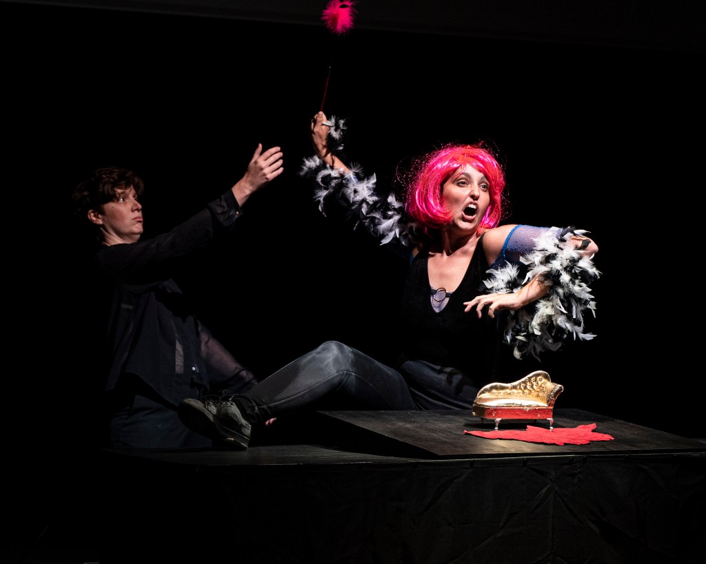 Una LEI, un LUI e il capolinea di un rapporto. In uno spazio che è al contempo luogo di reclusione, di terapia, di attesa, di gioco, di confronto, di perdono. Il pubblico, come un coro greco di terapeuti, di sciamani, di giudici, che recludono, curano, sentenziano. Assenze e presenze si rincorrono: Dio, datore di lavoro, è sollecitato a rispondere a una bizzarra candidatura. Una figlia reale o potenziale è a LEI congiunta e disgiunta attraverso il colore rosso. La protagonista si interroga con insistenza provocatoria e umoristica sull’essere donna, moglie e madre. Sente che nessuna identità compiutamente le appartiene. E dunque sceglie, infine, di auto-santificarsi e divenire una Madonna per gli anticonformisti, per gli scartati, per gli sbagliati. Per coloro che non si incastrano in nessuna pre-definizione sociale.