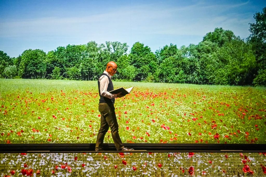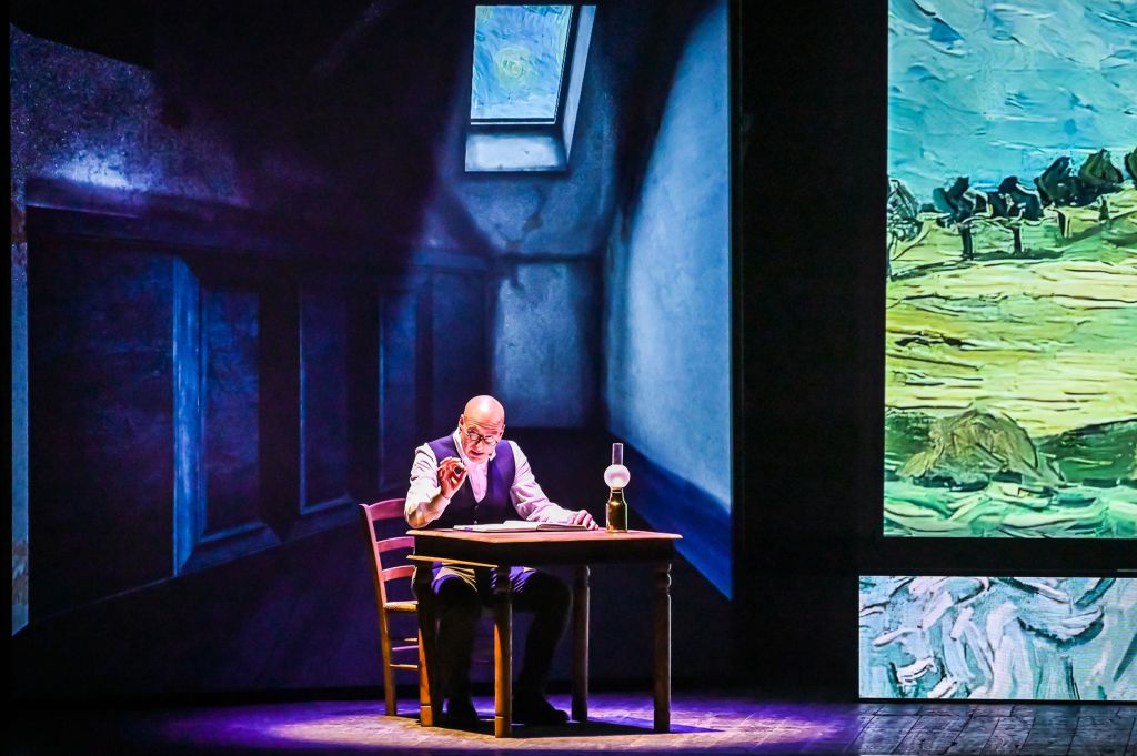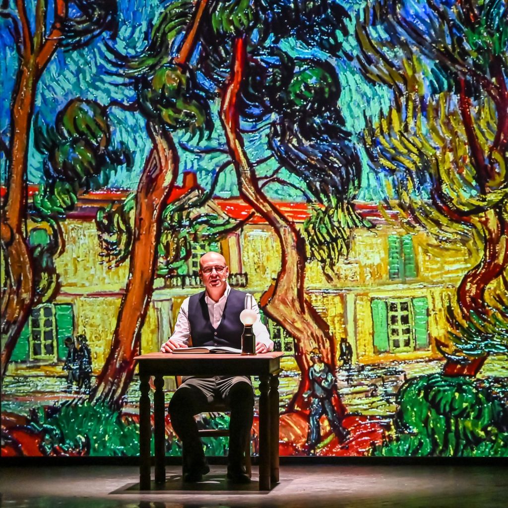 Tutta la scenografia punta moltissimo su un effetto di stupefazione davanti alle immagini dei quadri, i loro particolari e anche fotografie d’epoca. Oltre a una nutrita e suggestiva parte filmica appositamente girata nei luoghi di Van Gogh in Provenza, tra Arles e la pianura della Crau, le amate Alpilles e l’istituto di cura per le malattie mentali di Saint-Rémy nel quale scelse di stare per un anno. Poi i campi di grano e le strade di Auvers-sur-Oise, la casa del dottor Gachet e il fiume. Non mancano gli ambienti dell’Auberge Ravoux, dove Van Gogh ha vissuto nelle settimane finali. Così come non mancano, nelle immagini appositamente girate per lo spettacolo, i ricordi dei luoghi olandesi, e segnatamente la regione del Brabante nella quale era nato. Si tratta di un vero e proprio spettacolo nello spettacolo. Da assaporare restando seduti a teatro. Un aspetto, questo filmico, che viene continuamente rilanciato attraverso il grande schermo di sette metri, panoramico e infine arcuato, con proiezioni al laser in altissima definizione, che avvolge sulla scena Marco Goldin mentre racconta, arricchendo così enormemente la narrazione. Anche per effetto della lunga passerella che talvolta solleva Goldin, mentre vi cammina sopra, a mezzo metro dal livello del palcoscenico, rendendolo parte integrante dei paesaggi che scorrono alle sue spalle. E così è anche per i due ulteriori schermi che danno vita a quella sorta di scatola magica che è la piccola camera di Van Gogh, con tre soli elementi fisici come un tavolino, una sedia e una lampada. Dal cassetto di quel tavolino, nella prima scena dello spettacolo, esce il diario da cui tutto ha inizio.