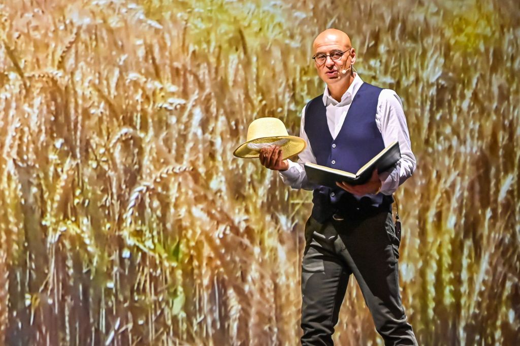 Seguendo il ritmo del suo romanzo uscito da poco, Gli ultimi giorni di Van Gogh. Il diario ritrovato, edito da Solferino, Marco Goldin sale sul palcoscenico per raccontare, con la sua consueta affabulazione appassionata e coinvolgente, le ultime settimane della vita di Vincent van Gogh. Nel libro alla base dello spettacolo egli immagina che Van Gogh avrebbe potuto tenere un diario proprio in quelle settimane finali e per questo gli presta la sua voce. Ovviamente mai staccandosi dai fatti realmente accaduti eppure dilatando molti vuoti e altrettanti silenzi del pittore. In quelle settimane conclusive l’artista olandese scrive tra l’altro un numero minore di lettere rispetto al solito e parla di meno della metà degli oltre settanta quadri che realizza. Il romanzo e lo spettacolo sono quindi un continuo gioco di specchi e di rimandi, tra i colori, le parole e i silenzi nei quali quasi si adagiano le musiche di Battiato. Quel diario (“un quaderno un po’ lacero, di pelle verde scura, con dei ricami dorati e il dorso nero”) viene ritrovato casualmente da Arthur Gustave Ravoux, il titolare della locanda nella quale Vincent vive tra la fine di maggio e la fine di luglio del 1890. Mancano due settimane alla morte del pittore e Ravoux sale nella sua camera di sottotetto per rifargli il letto e trova il cassetto dello scrittoio appena accostato. Lo apre e scopre quel diario di cui nessuno conosceva l’esistenza, ma non lo dice nemmeno a Theo. Da questo espediente narrativo parte anche l’azione teatrale, nel parlare quasi tra sé e sé che Goldin fa come fosse colui che accompagna Van Gogh, e dunque osservandolo lo racconta.