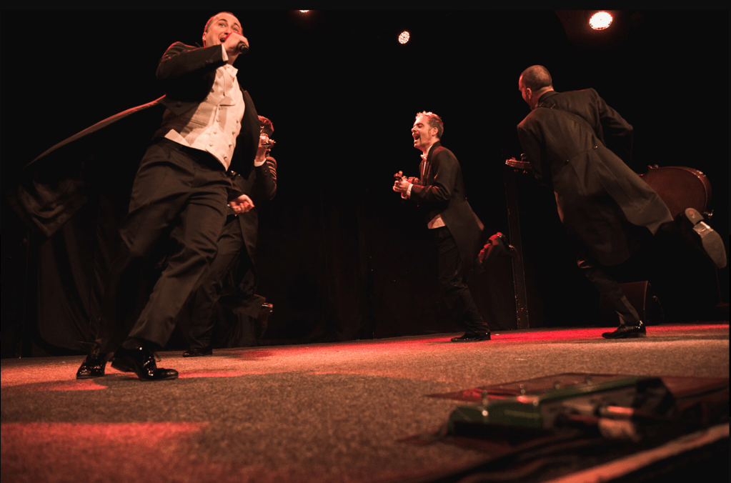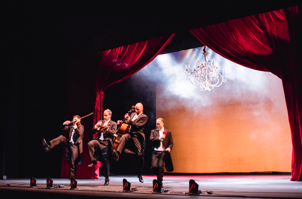 Tutto lo spettacolo è condito da esilaranti gag e variazioni sul tema: i violinisti saltano, si lanciano in “esecuzioni itineranti”, improvvisano un flamenco, e non mancano incursioni nella musica rock e pop contemporanea, da Serge Gainsbourg agli U2. Le gag, la fisicità e lo humour esplosivo, tipici del linguaggio teatrale dell’originale compagnia spagnola, hanno divertito le platee del mondo intero.