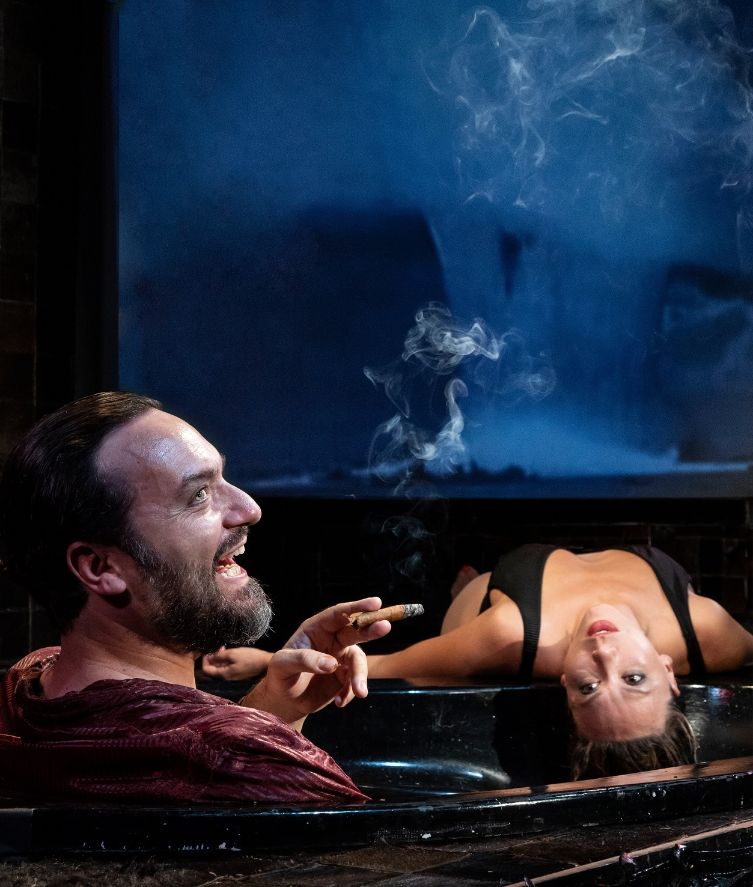 In un rifugio anti-atomico, immerso non a caso nelle acque putride di una vasca da bagno, questo faccendiere, in compagnia della sua escort russa, vive, mangia e si disseta, compra azioni e discetta a sostegno dell’ideologia neoliberista, cercando, con una sorta di conferenza strampalata e senza lieto fine, di adescare nuovi adepti tra il pubblico.