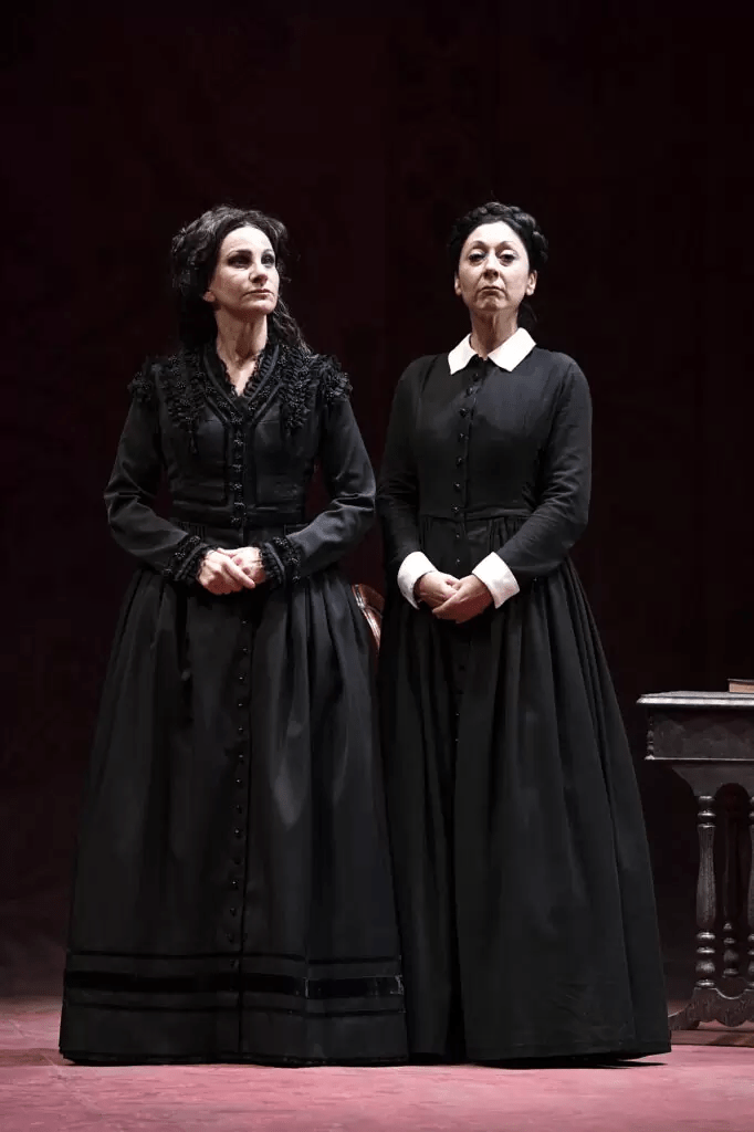 Annibale Ruccello aveva diviso la sua commedia in due atti che però Arturo Cirillo ha voluto assemblare in un unico tempo di circa due ore. Tuttavia, pur non essendo diviso da un intervallo, nella pièce è comunque ravvisabile uno stacco che la divide in due parti, dove nella prima prende il sopravvento una comicità dovuta soprattutto alla presenza di donna Clotilde con gli altri che le fanno da spalla, mentre nella seconda, in cui si consuma il dramma, a esercitare una supremazia è Gesualda e poi anche Don Catellino e Ferdinando per terminare con i quattro personaggi nelle ultime drammatiche scene. Per questo aspetto quella che all’inizio potrebbe apparire come una commedia di costume si rivela essere poi un dramma storico dal taglio classico, come lo definisce Cirillo nelle sue note di regia. E non a caso alcuni elementi scenici come il drappo rosso e il lampadario che cade oltre alle note musicali ne sono indizi rivelatori. Gli stessi abiti dei tre personaggi principali denunciano il loro essere più segreto che contiene frustrazione, perversione, passionalità mal esercitata o inappagata. Personaggi che agiscono l’uno contro le altre nel contendersi il corpo di Ferdinando che a sua volta si rivela anch’egli un calcolatore perverso. Commedia che diventa dramma crudele alla quale non è estranea la poetica di Artaud. Alla fine a Donna Clotilde affranta rimane la triste considerazione di quello che è il presente: “una volta i morti si mostravano ai vivi che ne avevano paura ora i morti non si mostrano più perché sono loro ad avere paura dei vivi”.