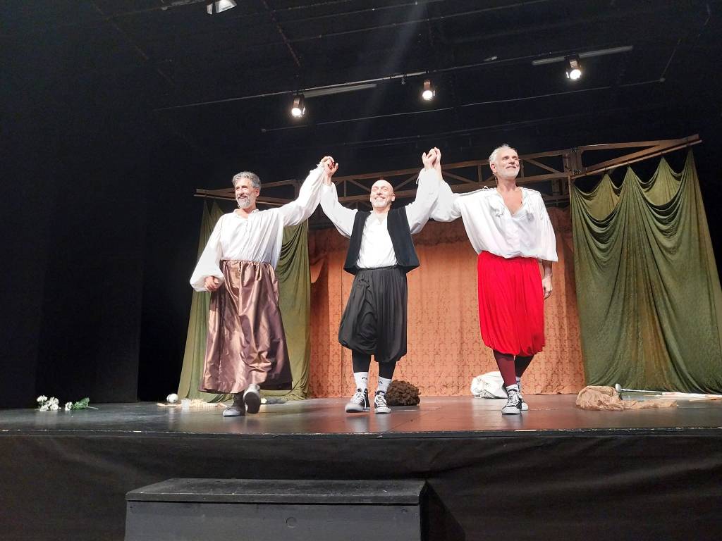 È di scena al Teatro Menotti uno degli spettacoli di maggiore successo della stagione, scritto da tre commediografi americani, Adam Long, Daniel Singer e Jess Winfield nel 1987 e che ha all’attivo oltre dieci anni di repliche al Criterion Theatre di Londra continuando a riscuotere successi un po‘ dappertutto. A riproporlo sul palcoscenico milanese per il terzo anno consecutivo sono i tre componenti della Compagnia La Macchina del Suono, Roberto Andrioli, Fabrizio Checcacci e Lorenzo Degl’Innocenti. Riprendo quanto già scritto nella mia precedente recensione del 2021 quando ebbi l’occasione di assistere alla prima della pièce costituita, come da titolo, da un condensato della durata di un’ora e mezza delle opere di Shakespeare che non può che risolversi in una parodia delle stesse, dove ciascuna di esse viene recitata per pochi minuti a un ritmo serrato che non dà spazio a un solo momento di stasi. Non a caso il sottotitolo dello spettacolo è il “Bignami delle opere di Shakespeare” e, proprio come un bignami, vengono recitate le parti più salienti delle commedie e dei drammi dello scrittore inglese. La scena è costituita da un fondale di stoffa che serve agli attori per i velocissimi cambiamenti di costumi che sono costituiti, al pari del materiale del fondo-scena, da pochi elementi quali parrucche e vestiti da donna indossati sui pantaloni e altri elementi poveri che servono per identificare i personaggi interpretati. Il tutto richiama alla commedia dell’arte.