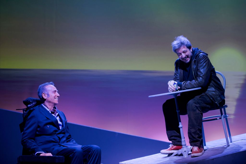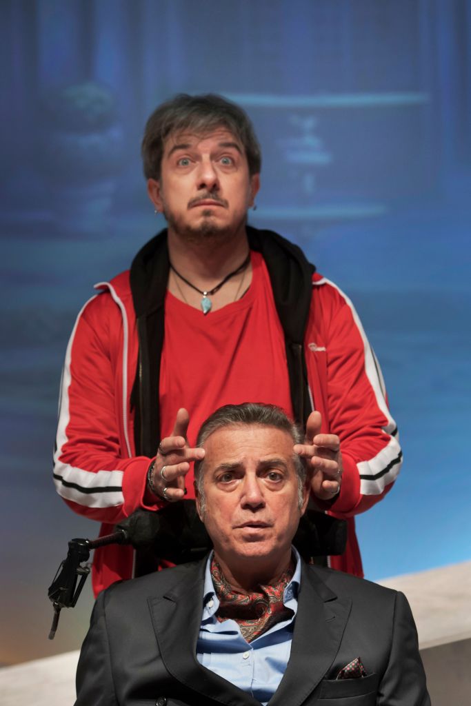 Per la regia mi sono immaginato un grande spazio aperto, un grande panorama illuminato come una giornata estiva, una notte autunnale, un pomeriggio piovoso. E un piano inclinato che dirada verso il proscenio e che racchiuda al suo interno tutti i luoghi della vicenda, che si aprono e diventano a volte studio, camera da letto, salotto, a volte ristorante eccetera. Ma poi richiudendosi all’interno del praticabile ci restituiscono solo una pianura inclinata in cui far scivolare dolcemente la sedia a rotelle o faticosamente spingerla in salita. Un non luogo esterno che potrebbe essere una spiaggia con il mare davanti, la platea, o un prato dove volano i parapendii e dove nel finale, per realismo magico, seguendo un aquilone che Driss fa volare nel vento di un pomeriggio, Philippe finalmente acquisisce la sua leggerezza e si stacca dalla sua sedia a rotelle e vola come se fosse sul parapendio lasciando finalmente quella sedia che lo schiacciava verso la gravità più̀ pesante del mondo. Philippe ha perso la gravità. Ha imparato la leggerezza e Driss, la leggera profondità̀ che non lo fa volare e tiene Philippe ancorato a sé, come un riferimento importante. La loro amicizia, una centratura, per vivere ed essere uomini un po’ più̀ consapevoli della meraviglia e poter ridere, finalmente a crepapelle. (Alberto Ferrari)