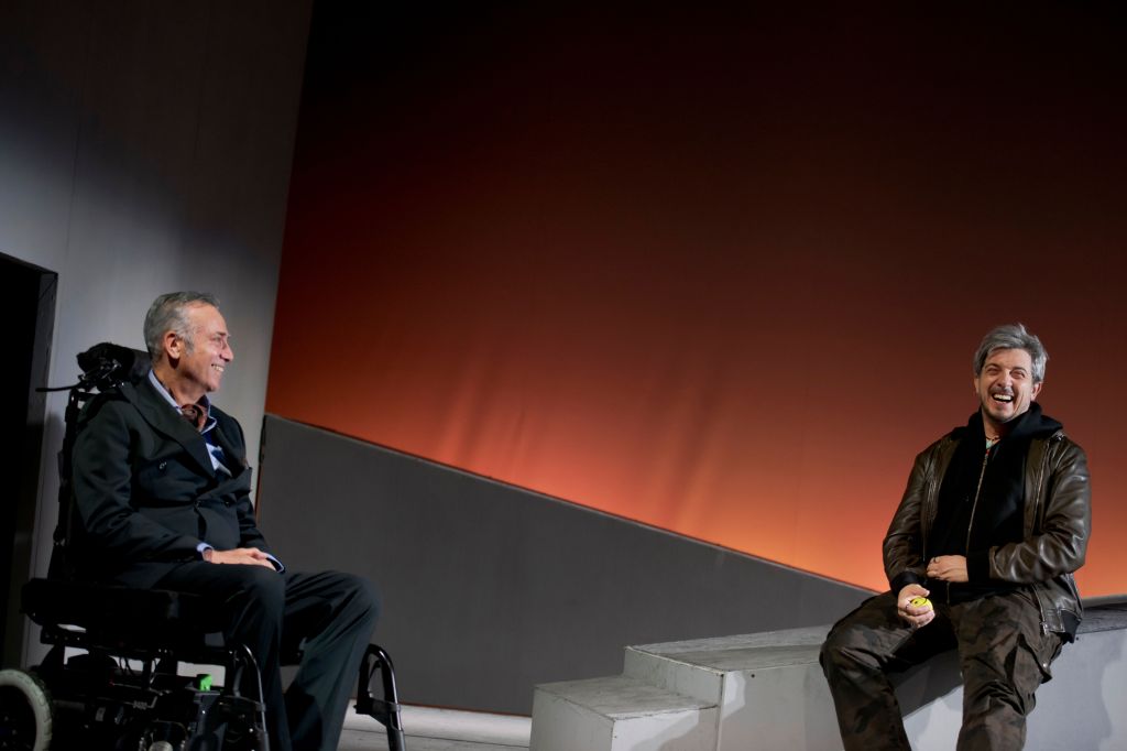 La commedia è la trasposizione teatrale del film “Quasi amici – Intouchables” diretto da Olivier Nakache e Éric Toledano del 2011 adattato da Alberto Ferrari che ne ha curato anche la regia e si ispira a una storia vera che aveva come protagonisti Philippe Pozzo di Borgo e Abdel Yasmin Sellou rispettivamente il malato e il badante. Sulla scena Filippo è impersonato da Massimo Ghini, dalla recitazione elegante che tocca le diverse sfumature che il personaggio richiede, fatte di passaggi dolenti, nostalgici fino a momenti di gaiezza liberatoria. Dris è un pirotecnico Paolo Ruffini che con la sua voluta cadenza livornese spinge al massimo le battute suscitando continuamente l’ilarità tra il pubblico. Raccontare l’evoluzione della storia sarebbe un grosso peccato perché le toglierebbe mordente e priverebbe gli spettatori delle numerose sorprese che si avvicendano sul palcoscenico specialmente per chi non ha visto a suo tempo il film. Occorre precisare che il valore della commedia non sta solo nella sua trama brillante che si risolve in un continuo crescendo (il rappresentarla in un atto unico senza soluzione di continuità è un ulteriore pregio perché non ne spezza il mordente). I temi che affronta sono quelli che interessano la vita del quotidiano di tutti noi: si parla di amicizia, di amore e di speranza. Viene fatto con allegria, con leggerezza ma anche con ironia e in pochi punti pure in modo politicamente scorretto ma funzionale.