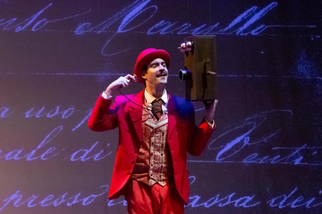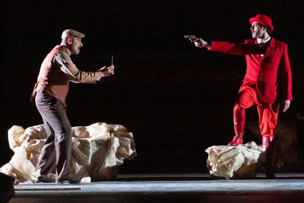 Eccoci pronti fisicamente, e in tal senso preparati mentalmente, ad assistere a uno spettacolo divertente tratto da uno dei romanzi più noti di Andrea Camilleri e, prima che si apra il sipario, siamo investiti dal suono stridente di una banda siciliana, che però non sembra così allegra come ci si aspetterebbe (si scoprirà alla fine che quella banda ha la cadenza di un funerale). E si intuisce così che il divertimento annunciato non è esente da tristezza il cui indizio viene appena tratteggiato all’inizio per poi manifestarsi pienamente alla fine. In effetti all’alzata del sipario i personaggi vestiti con costumi dai coloratissimi colori (firmati da Dora Argento) e che arrivano sul palco sono gravati da massi onerosi avvolti in panni bianchi simboli del peso delle convezioni alle quali sono soggetti. Si scoprirà poi che quegli oggetti assumeranno la funzione di sedie e di altri elementi di arredamento. Una storia tragicomica quindi, dove la parte esilarante, ricca di una serie di equivoci, si conduce per tutta la rappresentazione e racconta una vicenda intricata, per alcuni versi anche surreale, piena di colpi di scena e ambientata in Sicilia alla fine dell’800.
