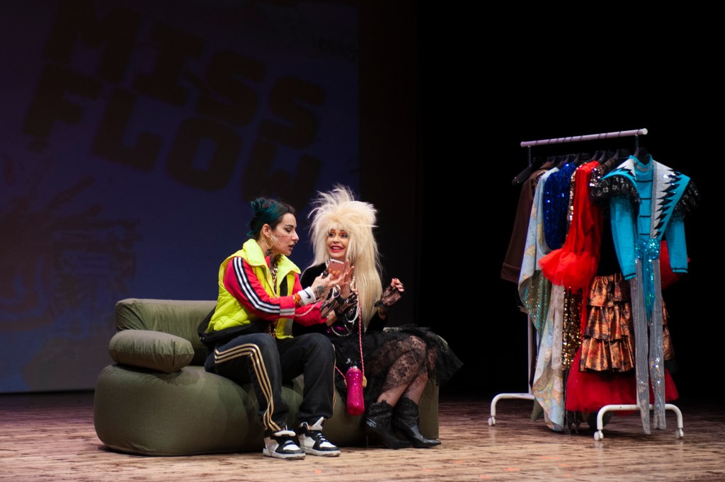 Il lavoro sui costumi fatto da Lucia Mariani è stato fondamentale per dare credibilità ai personaggi. Insieme ai musicisti Edoardo Simeone e Luca Capomaggi ho lavorato sulle sonorità delle due epoche e ho scritto i testi di tre canzoni: una trap (Unica), una in stile anni ’80 (Bimba) e una “sanremese” (Bomba) perché alla fine Asia e Miss Flow saliranno sul palco di Sanremo, portando nella canzone la loro esperienza artistica e di vita. (Francesca Zanni)