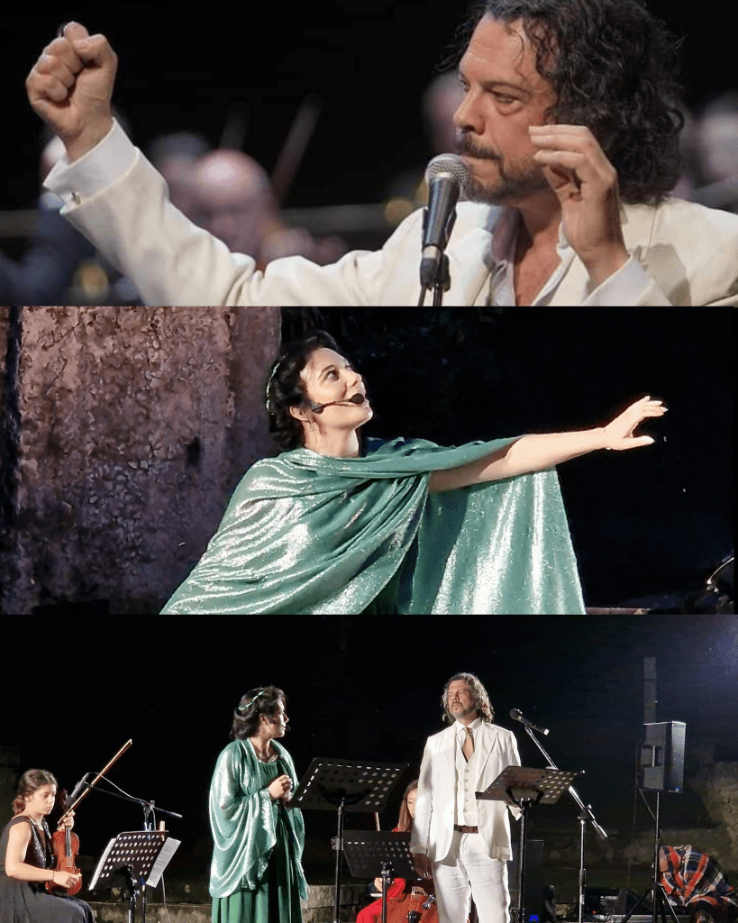 “Ad interpretare il non facile ruolo dei due divi, il regista Mino Francesco Manni e Marta Ossoli. A sottolineare i momenti salienti, in sottofondo, le magnifiche Eleonora Liuzzi (al violino) e Yuriko Mikami (al violoncello) che hanno fatto magie con i loro armonici. Diversi sono stati i brani che hanno suonato ma a far vibrare le mie corde lo ”Storm” di Vivaldi e “Clair de Lune” di Debussy. Tutti e quattro gli artisti mi hanno fatta immergere nell’intensa storia d’Amore tra D’Annunzio e la Divina e nell’intima compenetrazione tra loro stessi e la Natura (in particolare durante l’introduzione della Ossoli nel mentre che, uscendo da una pianta, ha recitato la parte della Demente del “Sogno di un mattino di primavera” e, nel finale, mentre usciva coi capelli sciolti dal boschetto recitando ” La pioggia nel pineto”). La calda voce di Manni mi ha scaldata dall’incipit con le bellissime poesie ” Occhi” e “Voglio un amore” che finora non conoscevo. Altri momenti emozionanti sono state le letture di parti de “Il Fuoco” e di alcune lettere della Duse da Marsiglia del 30 marzo 1898 e da Berlino del 20 aprile 1902. Spettacolo incantevole che rimarrà nel mio cuore per sempre” (Vittoriale degli Italiani 16 /06/23)