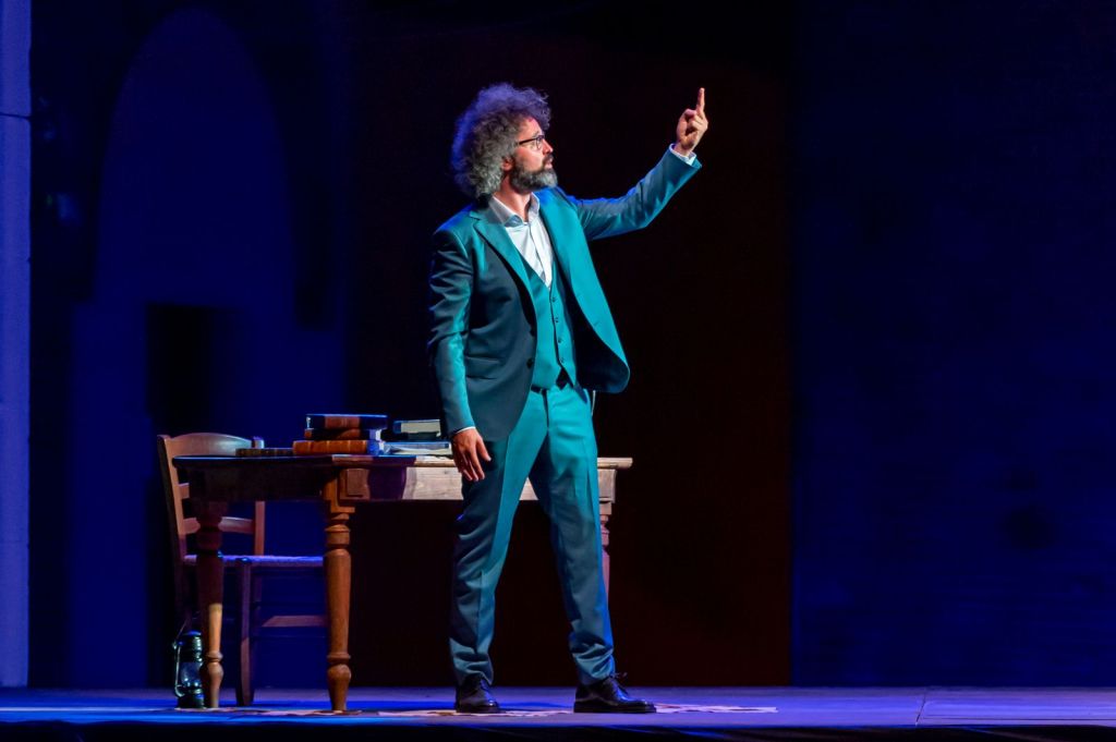 Un uomo solo sul palco, cantautore, ma anche bravissimo attore, Cristicchi passa dalla narrazione al canto per dirci il senso più profondo del paradiso, ciò che lui ha capito del messaggio di Dante, svelando anche episodi ed emozioni della sua vita d’artista. Ogni stacco è stato segnato da applausi fino al trionfo con il pubblico in piedi quando Cristicchi recita il trentatreesimo canto e canta i suoi versi più celebri: l’Inno alla Vergine Madre. (C.B., La Nazione)