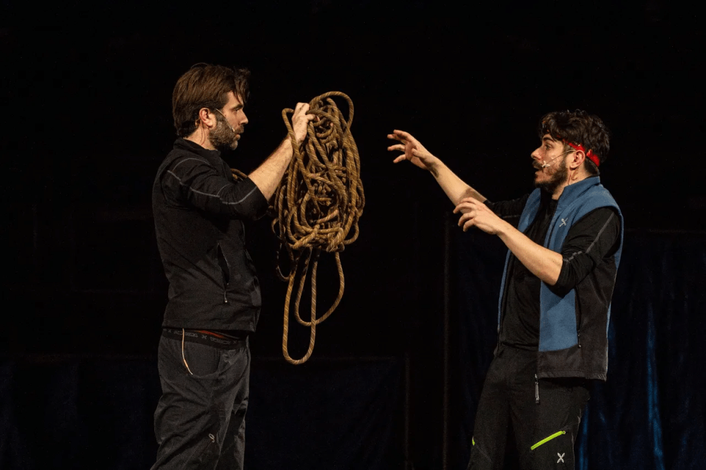 Nella splendida cornice del Castello Sforzesco di Milano, Jacopo Maria Bicocchi e Mattia Fabris raccontano l’incredibile storia vera degli alpinisti Joe Simpson e Simon Yates. È la storia di un sogno ambizioso: essere i primi al mondo a scalare il Siula Grande, attaccato dalla parete ovest. Ma è anche la storia di un’amicizia e della corda che, durante quella terribile impresa, lega questi due giovani ragazzi. La corda che mette la vita dell’uno nelle mani dell’altro. Come sempre avviene in montagna, c’è dunque una cima da raggiungere. C’è l’estenuante conquista della vetta. C’è la gioia dell’impresa riuscita. E infine, quando il peggio è passato, e la strada è ormai in discesa, c’è la vita, che fa lo sgambetto, e c’è la morte che strizza l’occhio: un terribile incidente in alta quota, Joe durante una banale manovra, si rompe una gamba.