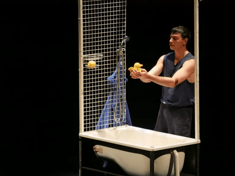 Sia riconosciuto merito all’MTM (Messaggerie Teatrali Milanesi) che, a chiusura del proprio Festival Hors 2024, ha ospitato il 28 settembre nella propria sede del Teatro Litta il pregevole testo “Affogo” di Dino Lopardo, uno degli autori e regista tra i più acclamati della nuova generazione. Lucano di nascita, si contraddistingue per la scelta di portare in scena testi ambientati principalmente nella sua terra e che descrivono il disagio del vivere di giovani emarginati, bersagli di soprusi e angherie da parte di una società al degrado. E lo fa ricorrendo a un linguaggio crudo, dove i fatti violenti vengono descritti minuziosamente e senza mezzi termini, in un dialetto stretto che sa andare in profondità e con la veemenza verbale di cui il personaggio-vittima si fa portavoce. “Affogo” è il secondo episodio di una trilogia, quella che Lopardo chiama, per l’appunto, “Trilogia dell’odio”, essendo questo il sentimento costante a essere il protagonista indiscusso delle pièce. A occupare la scena è Nicholas, interpretato dal talentuoso Mario Russo, che evoca la sua vita vissuta tra i maltrattamenti fisici e morali inflittigli da una sua zia, con la quale aveva vissuto insieme al fratello, e che, insieme a continui episodi di bullismo dovuti al suo fisico grassoccio, gli avevano forgiato un carattere di rancore. Lo fa chiuso in un bagno per buona parte del tempo dentro una vasca posta al centro della scena che rimane completamente al buio per il resto della zona. Quando era ragazzo sognava di diventare un famoso campione di nuoto e però la paura dell’acqua generata dalle sue insicurezze gli faceva capire che sarebbe stato difficile realizzare quel sogno. Lo racconta a una paperella che tiene tra le mani e che rappresenta quasi il suo alter ego nel momento in cui cerca di insegnarle a nuotare tuffandola ripetutamente nell’acqua. È rabbioso nel raccontarsi e più che narrare, rimugina sulle tappe più dolorose affrontate nella sua vita. E, più che sentirle dire apertamente, si intuiscono colpe da lui commesse perché provocate dai torti subìti e alla fine c’è lo spazio del riscatto nel momento in cui, facendo intendere di aver superato le sue paure dell’acqua, mostrerà il suo fisico scolpito dai muscoli e non esiterà a mostrarsi vestito solo con un succinto costume da bagno e, nella gestualità tipica dei campioni di body building, si porterà sul centro del proscenio, farà accendere le luci in sala e provocherà il pubblico gridando “fotografatemi”.