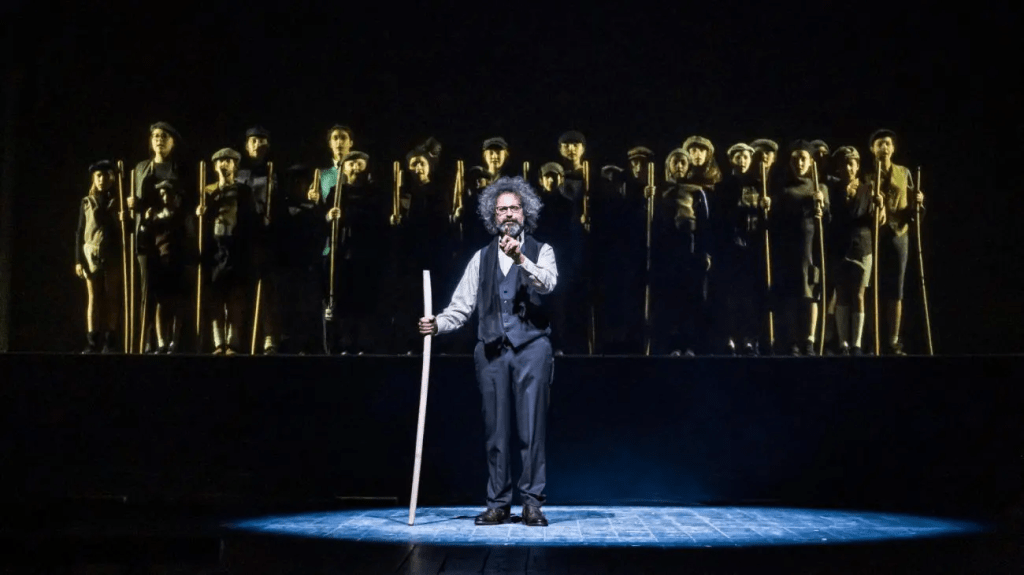 Nel corso dello spettacolo Cristicchi esce e entra nei panni del personaggio di Persichetti. Nel primo caso racconta altri accadimenti inerenti a fatti dolenti che interessarono il territorio come quello che riguardò un centinaio di persone, perlopiù ragazzi, che assistevano a una gara di nuoto e rimasero uccisi da un’esplosine di materiale bellico sulla spiaggia di Vergarolla. O anche quella dei circa duemila operai comunisti di Monfalcone che, dopo essersi trasferiti in Jugoslavia, subirono nel 1948 la “rieducazione” nell’isola di Goli Otok voluta da Tito quando questi si era distaccato dalla linea di Stalin che lo aveva isolato accusandolo di nazionalismo e deviazionismo rispetto alla dottrina marxista-leninista. E lo fa aiutandosi anche con le canzoni, la maggior parte scritte da lui, anche se non tutte. Non quell’intensa “1947” a firma di Sergio Endrigo, anche lui appartenente al gruppo degli esodati quando a 14 anni con sua madre lasciò Pola, la sua citta natale. E lo fa anche in chiusura con un coro di bambini, i Mitici Angioletti di Maria Francesca Polli che aggiungono grazia e spessore a tutto l’evento.