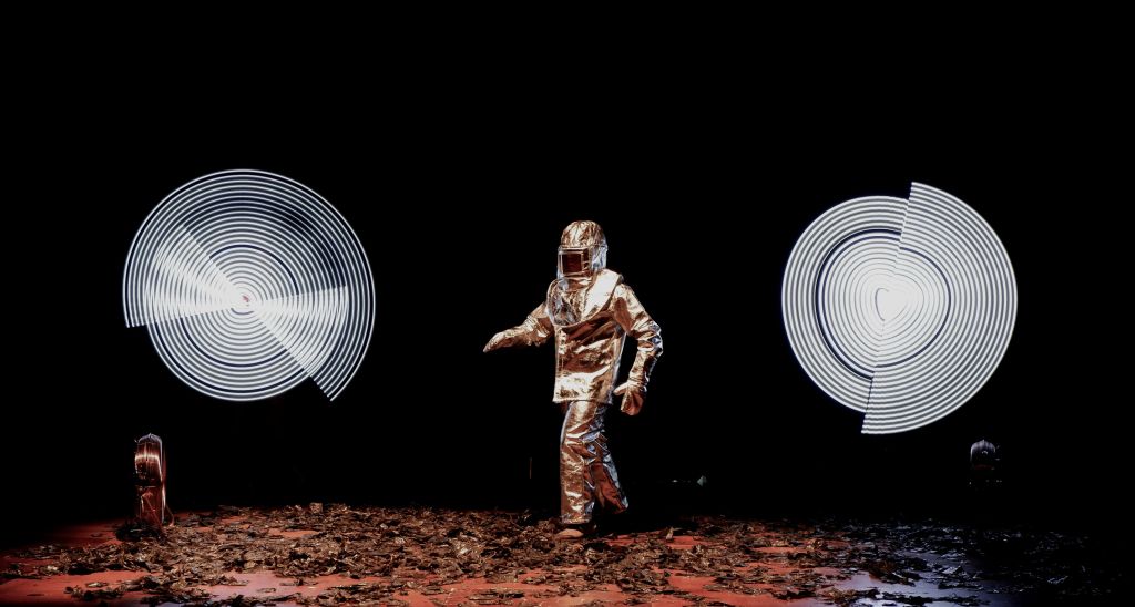 lo spettacolo entra nel vivo quando i cinque si svestono dei loro abiti per indossare quelli dei calciatori e da quel momento iniziano il gioco che si fa sempre più convulso e segue le frasi del cronista nella sua “telecronaca” della quale appaiono sul piccolo televisore a destra della scena le immagini di volti di personaggi famosi legati allo sport. Non è necessario essere esperti di calcio per apprezzare i movimenti atletici (dribbling, affondi, tackle, ecc.) perché l’azione è appassionante di suo grazie alla bravura dei cinque artisti. Ma poi le maglie diventano grigie, così come da tempo sono ingrigiti anche i polmoni. e la scena poi si popola di carta incenerita smossa da una serie di ventilatori che sembra vogliano depurare l’aria ma non vi riescono, appare una figura intrappolata in una tuta ignifuga che avanza lentamente in un immaginario paesaggio oltre il definito, metafora di quello che sarà il futuro dell’umanità. La riflessione su quello a cui andremo incontro sorge spontanea.