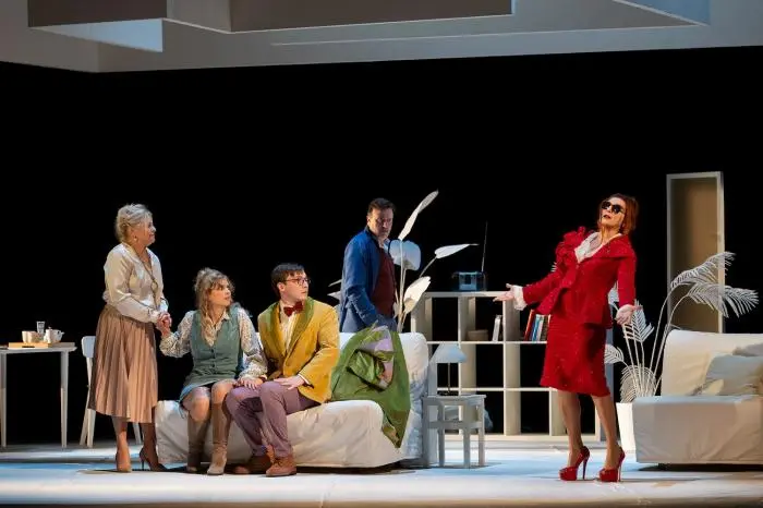 L’ambiente dove troneggia un letto, inteso come luogo per dormire ma anche simbolo di immobilismo e di lussuria, è lo scenario delle discussioni più accese dove Yvonne (Mariangela Granelli) esprime il suo malessere che non è solamente fisico ma soprattutto mentale. Il suo sonno è funestato da un sogno ricorrente, quello che si vede all’inizio dello spettacolo dove lei è posseduta da un essere discinto che la censura imposta dal suo inconscio non le permette di identificare. Desiderio soffocato di giorno ma accolto di notte a soddisfare la brama di piacere proprio quando i freni inibitori sono sciolti. Su un pavimento formato da piastrelle bianche e nere a formare una metaforica scacchiera dove i personaggi si muovono come pedine, ciascuno giocando una partita in cui non si sa chi vincerà. Per terra indumenti intimi sparsi qua e là che Léonie (Milvia Marigliano) va raccogliendo: se Yvonne rappresenta un disordine mentale che si esprime anche fisicamente, lei ammette di essere maniaca dell’ordine e il suo affannarsi per fare pulizia ne è il sintomo. Due sorelle: la prima che ha iniziato a trascurare il marito nel momento in cui le è nato il figlio, Michel (Cosimo Grilli), che crescendo è diventato il suo unico oggetto d’amore fatto anche di una (inconfessabile) natura fisica; la seconda che aveva rinunciato all’uomo amato per cederlo alla sorella. Tra loro George (Filippo Dini), l’uomo di età matura, che, disamato dalla moglie, cerca tra le braccia di una giovane amante, Madeleine (Giulia Briata), quel rapporto fatto di sentimento e di sesso che possa dargli la sensazione di sentirsi ancora giovane (“La mia ultima opportunità”, così l’uomo giustificherà la sua avventura, ormai conclusa, in un momento cruciale della vicenda quando confesserà il tutto alla cognata).