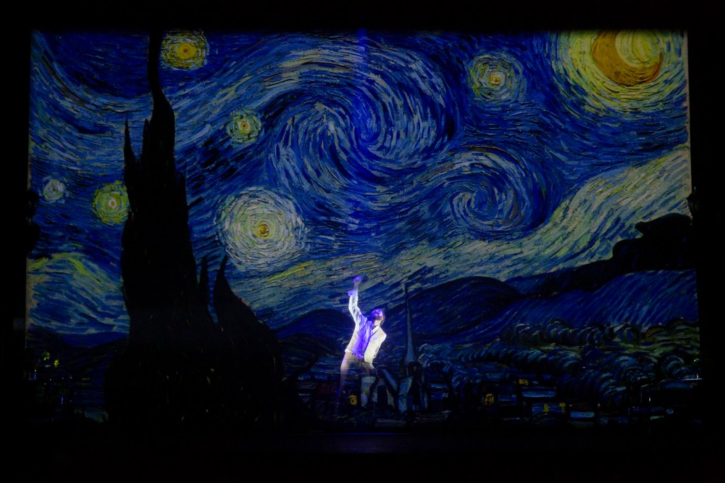 in un Café Chantant Parigino, nel quale una scena suggestiva, la musica di un’orchestra dal vivo, il canto di un cast d’eccezione e coinvolgenti coreografie prendono vita e colore grazie, anche, ad emozionanti proiezioni animate 3D che rendono le opere di Vincent vive e meravigliosamente immersive.