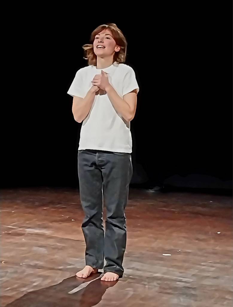 All’entrata del pubblico, l’attrice è già presente in una scena completamente vuota mentre, ginocchioni, lava il parterre in tutta la sua estensione aiutandosi di uno straccio che continua a bagnare e a strizzare. Sono movimenti ripetitivi, ossessivi, nella ricerca di fare una completa pulizia (per rendere il luogo più degno di accogliere la sacra figura che sta per essere evocata?). Poi, dopo che tutti gli spettatori si saranno assisi, si reca a prendere due altoparlanti che erano nascosti dietro il fondale, li colloca al centro della scena, e infine predispone al centro un’asta con microfono attraverso il quale inizierà l’oratorio.
