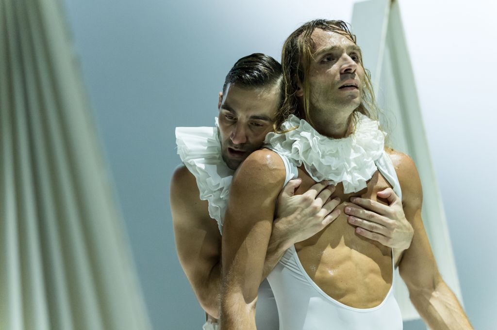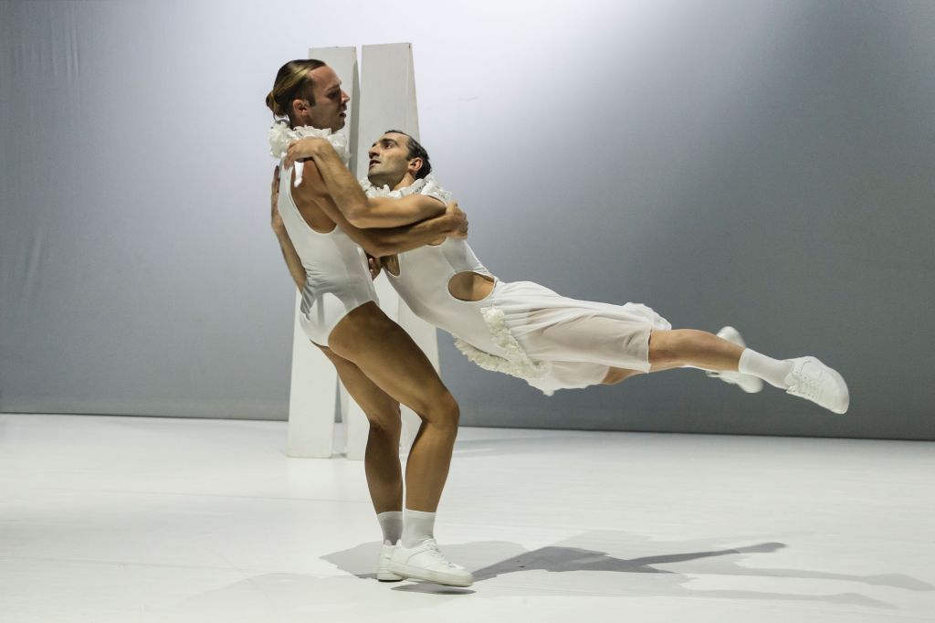 Il predominante colore bianco della scena si ritrova anche nei preziosi costumi di taglio moderno ma d’ispirazione classica e che è riscontrabile per esempio nell’utilizzo del tulle o nell’uso della gorgiera per i due protagonisti, distinguibili in questo modo dagli altri danzatori. Elementi che si richiamano a codici del balletto classico per poi ribaltarli in un linguaggio innovativo, attività distintiva della Compagnia che trova spazio nella ricerca e nella sperimentazione coreografica. È questo l’intento per cui il coreografo Nyko Piscopo nel 2019 ha fondato CORNELIA Dance Company insieme ai danzatori Nicolas Grimaldi Capitello, Eleonora Greco, Leopoldo Guadagno e Francesco Russo, presenti nella messa in scena di Gisellǝ insieme a altri quattro (nei crediti i loro nomi). La coreografia di Piscopo si avvale della musica composta per l’occasione da Luca Canciello caratterizzata da movimenti variamente articolati che passano da toni tenui a altri più energici in sintonia con i movimenti coreografici esprimenti stati d’animo dei vari personaggi. Musica dal taglio più che lodevole e tuttavia mi sorge spontaneo un pensiero: essendo il balletto fatto oltre che da una parte coreografica anche da una componente musicale, perché prenderne uno classico, anzi il più celebre dei balletti classici, dargli una forma moderna e rinunciare alla partitura musicale originale? Perché non utilizzare parti della musica di Adolphe-Charles Adam, naturalmente arrangiata e, perché no?, anche stravolta con sonorità moderne? Sul fondale della scena appare, nel momento di maggiore vivacità della danza, il video di movimenti danzanti che contrapponendosi a quelli che avvengono sul palco ma nella realtà non sembrano essere determinanti allo sviluppo della storia, anzi rischiano di distogliere l’attenzione che dovrebbe essere posta esclusivamente ai danzatori presenti fisicamente sul palcoscenico. La bella coreografia di Nyco Piscopo, che si occupa anche della regia, ricca di inventiva e di momenti affascinanti, impegna sapientemente un corpo di ballo collaborativo del quale è d’uopo accennare Nicolas Grimaldi Capitello e Leopoldo Guadagno dalla tecnica brillante e dalla notevole capacità espressiva.