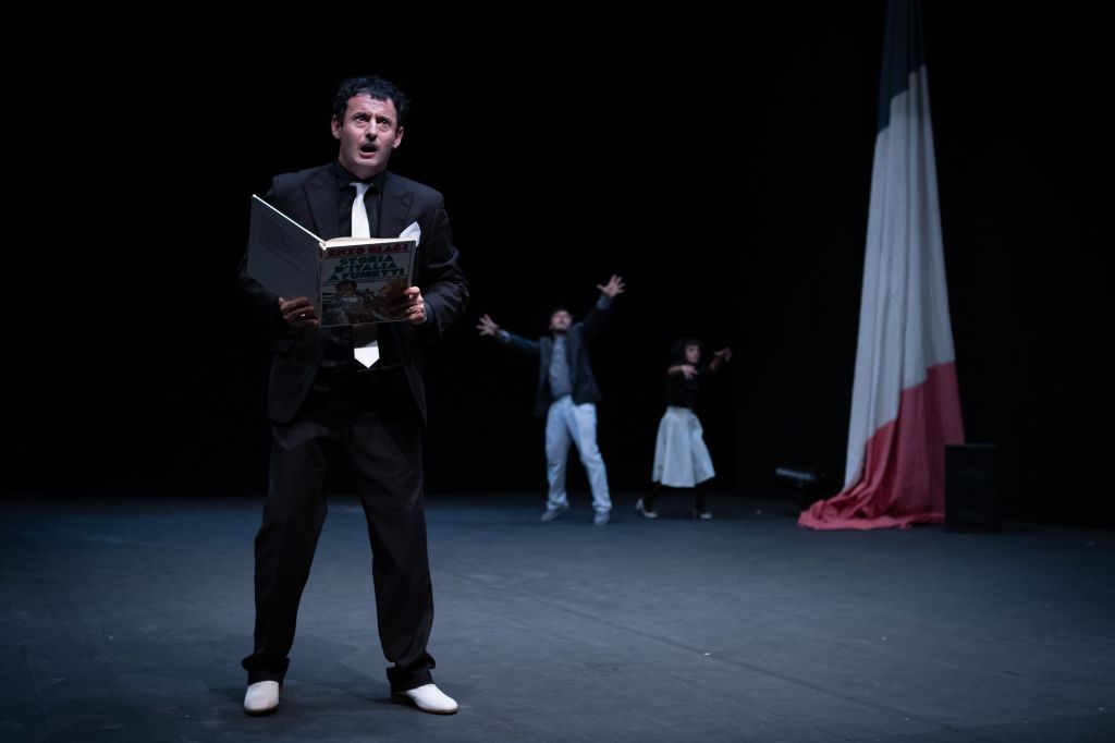 230 anni dopo la Rivoluzione Francese Elvira Frosini e Daniele Timpano con la loro scrittura affilata e ironica scandagliano l’apparato culturale occidentale con tutti i suoi simboli e le sue retoriche fino ad arrivare all’osso dei suoi miti fondativi: passato e presente, storia francese e storia italiana, modernità e postmodernità si sovrappongono sul palco in un percorso volto a mettere in crisi le nostre vite democratiche e l’immaginario legato al concetto di rivoluzione. La domanda è se c’è ancora la possibilità dello scoppio di una rivoluzione oppure questa è legata a un passato irripetibile nel nostro secolo.