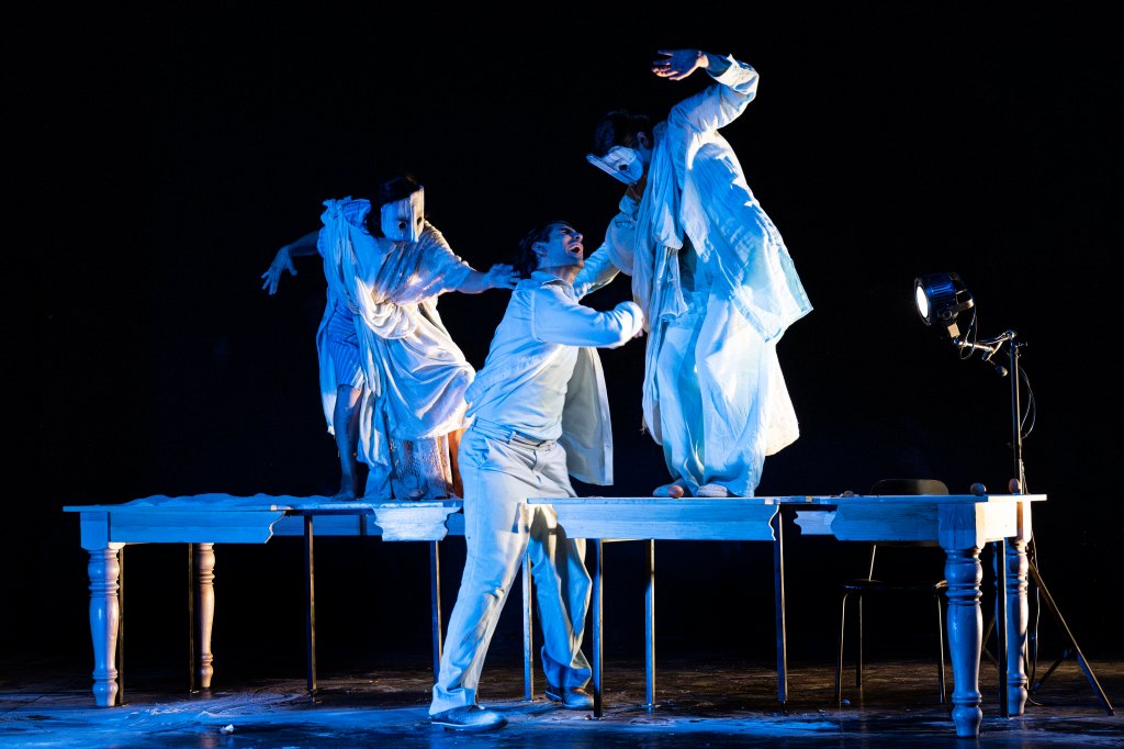 I tre protagonisti Marika Pensa, Simone Tudda e Sandra Zoccolan si muovono energicamente sulla scena compresa la Pensa che nella recita alla quale ho assistito ieri sera ha recitato con stampelle a causa di un incidente occorsele. Oltre a interpretare i personaggi principali danno corpo e voce anche a quelli secondari assumendo i ruoli di vittime e carnefici. Alla recitazione strettamente verbale, fatta di chiaroscuri e oscillante tra diverse sfumature, cantano i cori le cui musiche originali sono di Giulia Bertasi. Malgrado il tema trattato sia di natura drammatica nella rappresentazione non mancano nei dialoghi momenti di leggerezza con battute che inducono al riso e sono quelle che si scambiano le donne del terzo episodio o della descrizione fatta da Francesco sulla vita che si conduceva sull’isola.