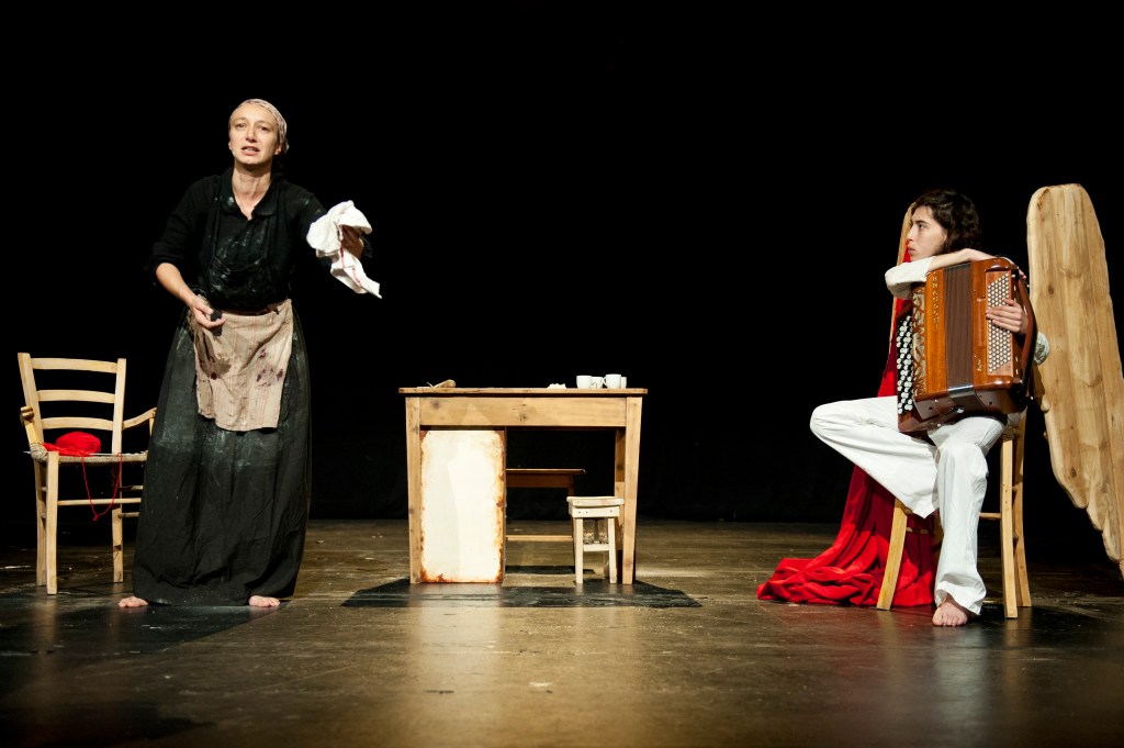 La regia di Gigi Dall’Aglio si distingue per l’originale ambientazione, propria di una persona del popolo dalle scarse condizioni economiche (la Mater si lamenta nel ricordare al figlio che lei lo avrebbe voluto lavoratore che aiutasse la famiglia). Accanto alla scarità degli arredi nei quali prevale la sedia della Mater, ben diversa dai troni usualmente utilizzati per le rèine dei primi due lai, le luci di Pietro Paroletti richiamano, con l’accesa cromatura del rosso, il colore simbolo della carne e del sangue che è anche lo stesso della fascia sopra la spalliera del sedile dell’angelo. La base dello scenario, dovuto alla penna di Maria Spazzi, è costituita da una sorta di altare sulla quale si celebra il rito della rappresentazione del dolore che la Mater dedica agli ascoltatori. Arianna Scommegna, attrice dall’enorme caratura vocale e scenica sa rendere con padronanza tutte le varie sfumature di una madre che piange il figlio morto ma anche donna che, sia pure a livello di pancia, esprime dissenso di fronte a un destino crudele. Lodevole accanto a lei la brava Giulia Bertasi, che con il suono della fisarmonica contribuisce a creare l’atmosfera adatta alle varie fasi della narrazione.