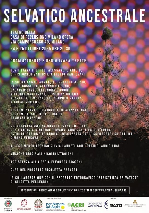 La compagnia teatrale Opera Liquida, fondata e diretta da Ivana Trettel, presenta il suo nuovo e potente spettacolo: Selvatico Ancestrale. L’appuntamento è per il 24 e 25 ottobre alle ore 20.30, presso il teatro della Casa di Reclusione Milano Opera, in collaborazione con la Direzione del carcere. Lo spettacolo sarà aperto a un pubblico misto, composto da persone detenute e spettatori provenienti dalla città.