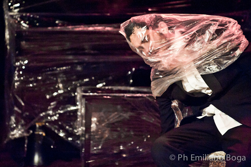 La scena è un luogo sospeso: due piani che si rispecchiano e si confondono. In basso, la realtà della solitudine; in alto, l’anima che dialoga con il divino, trasformando la sofferenza in cabaret, il dolore in ironia. È sogno o memoria? Presente o aldilà?