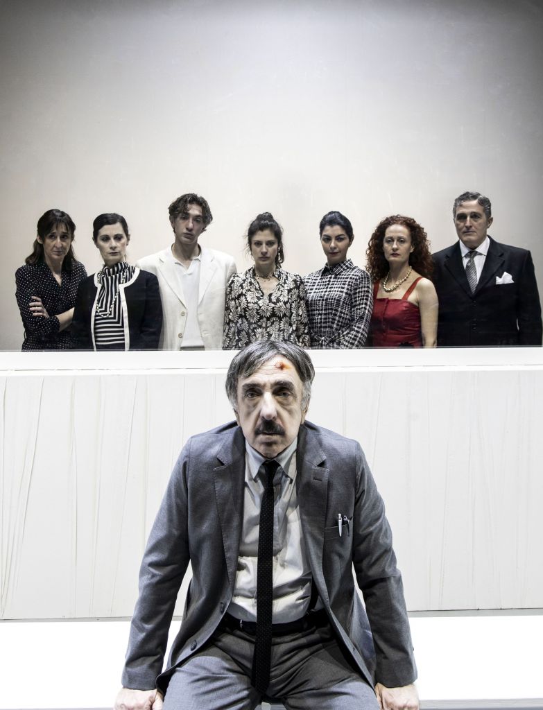 In un ambiente fisso rappresentante casa Fiorìca e costituita da una scena asettica in cui domina il colore bianco con una vetrata trasparente sul fondale che a un certo punto si anima magrittianamente di abiti sospesi, si muovono i personaggi in una serie di dialoghi che da preparatori si fanno sempre più crescenti con il procedere dell’azione. La storia è nota: la padrona di casa, Beatrice (Stefania Medri), sobillata dalla Saracena, si prepara ad attuare il suo piano che le permetterà con l’aiuto del commissario Spanò (Davide Lorino) di far cogliere in fallo il marito fedifrago e per questo ha già pronto un piano d’attuazione ricorrendo all’aiuto dell’ignaro Ciampa (Silvio Orlando) di cui sente di poter disporre essendo lui lo scrivano di suo marito, il Cavalier Fiorìca che non appare mai in scena.