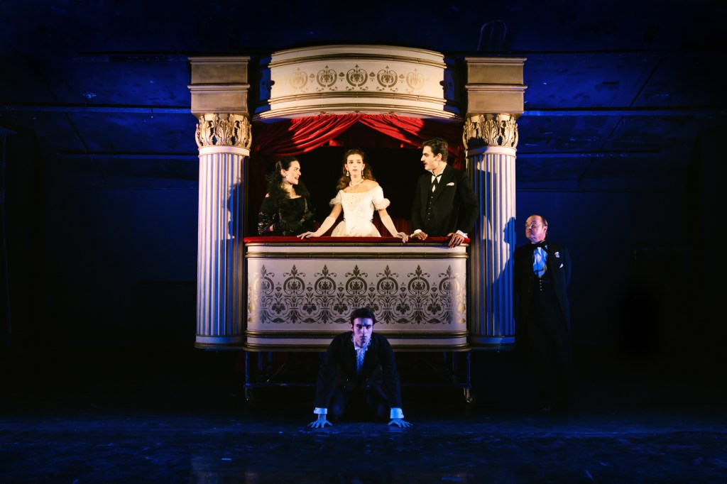 Lo spettacolo da me visto ieri sera al Teatro Fontana e dovuto alla drammaturgia e regia di Giovanni Ortoleva, che si è avvalso anche della collaborazione del dramaturg Federico Bellini, vede in scena i cinque personaggi che si muovono in una scenografia minimalista creata da Federico Biancalani in cui l’elemento fondamentale di arredo è costituito da una struttura che, ruotante su sé stessa a opera degli artisti stessi, mostra vari punti in cui si svolge l’azione principale e costituiti da un salotto cittadino, una camera da letto, la sala di un alloggio di campagna e principalmente da un palchetto di teatro. È qui che appare per la prima volta Margherita (Anna Manella) agli occhi di Armando Duval (Alberto Marcello) che subito ne rimane affascinato rimanendo colpito dal classico coup de foudre al punto da restare anche indifferente alla notizia che la donna sia una cortigiana mantenuta da un ricco e gelosissimo duca. A informarlo in tal senso è l’amico Gastone (Vito Vicino) frequentatore abituale della ricca e nobiliare vita parigina.